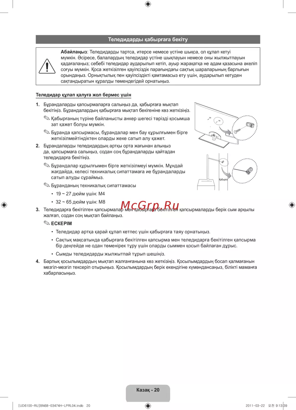 Samsung UE32D6100SW — теледидарды қабырғаға бекіту: қауіпсіздік шаралары мен нұсқаулық [82/84]