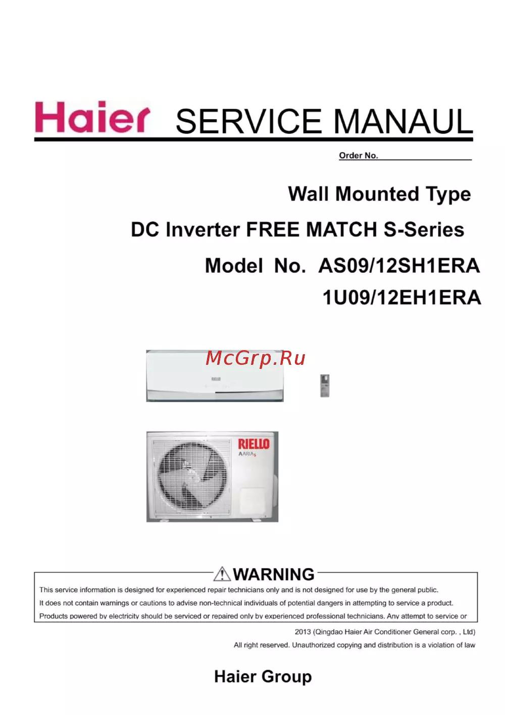 Haier SERVICE MANAUL Order No Wall Mounted Type DC Inverter FREE MATCH S Series Model No AS09 12SH1ERA 1U09 12EH1 ERA A WARNING This service information is designed for experienced repair technicians only and is not designed for use by the general public It does not contain warnings or cautions to advise non technical individuals of potential dangers in attempting to service a product Products powered bv electricitv should be serviced or repaired only bv experienced professional technicians Anv attempt to service or 2013 Qingdao Haier Air Conditioner General corp Ltd All right reserved Unauthorized copying and distribution is a violation of law Haier Group