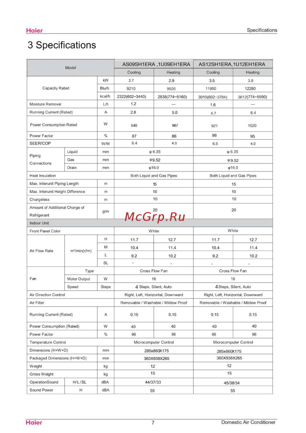 Haier Specifications 3 Specifications AS09SH1ERA 1U09EH1 ERA Model Cooling Capacity Rated Heating AS12SH1ERA 1U12EH1ERA Cooling Heating kW 2 7 2 9 3 5 3 8 Btu h 9210 9920 11950 12280 kcal h 2322 602 3440 2838 774 5160 3010 602 3784 3612 774 5590 Moisture Removal L h 1 2 1 6 Running Current Rated A 2 8 5 0 4 7 6 4 Power Consumption Rated W 540 967 921 1520 Power Factor 87 86 98 95 W W 6 4 4 0 6 5 4 0 SEER COP Liquid mm Ф 6 35 Ф 6 35 Gas mm Ф9 52 Ф9 52 Drain mm ф16 0 Ф16 0 Piping Connections Heat Insulation Both Liquid and Gas Pipes Both Liquid and Gas Pipes Max Interunit Piping Length m 15 15 Max Interunit Height Difference m 10 10 Chargeless m 10 10 g m 20 20 Amount of Additional Charge of Refrigerant Indoor Unit Front Panel Color Air Flow Rate H 11 7 12 7 11 7 12 7 M 10 4 11 4 10 4 11 4 L 9 2 10 2 SL m3 min cfm Type Fan White White Motor Output Speed W Steps Air Direction Control Air Filter 9 2 10 2 Cross Flow Fan Cross Flow Fan 16 16 4 Steps Silent Auto 4 Steps Silent Auto Right Left Horizontal Downward Right Left Horizontal Downward Removable Washable Mildew Proof Removable Washable Mildew Proof Running Current Rated A 0 15 0 15 0 15 Power Consumption Rated W 40 40 40 40 Power Factor 96 96 96 96 Temperature Control Microcomputer Control 0 15 Microcomputer Control Dimensions H W D mm 285x860X175 285x860X175 Packaged Dimensions HxWxD mm 360X938X265 360X938X265 Weight kg 12 12 Gross Weight kg 15 15 dBA 44 37 33 45 38 34 dBA 55 55 Operationsound Sound Power Haier H L SL H 7 Domestic Air Conditioner