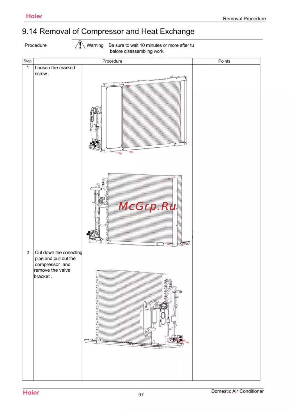 Haier Removal Procedure 9 14 Removal of Compressor and Heat Exchange Procedure Step Be sure to wait 10 minutes or more after tu before disassembling work Procedure Points 1 Loosen the marked screw 2 Cut down the conectinc pipe and pull out the compressor and remove the valve bracket Haier 97 Domestic Air Conditioner