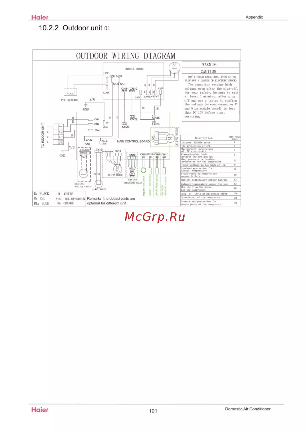 Haier Appendix 10 2 2 Outdoor unit 01 OUTDOOR WTRTNG DIAGRAM WARNING NODULE BOARD CAUTION CN9 CN8 DON T TOUCH CAPACITOR EVEN AFTER PLUG OFF DANGER OF ELECTRIC SHOCK AC N AC L R 11 The capacitor retains high CN1 CN11 CN10 voltage even after the plug off For your safety be sure to wait vDlC CN4CN3CN2 at least 5 minutes after plug off and use a tester to confirm the voltage between connector P and N on nodule board is less than DC 10V before start servicing CN26 CN22 CN1 CN2 CN23 3м GND 5 MAIN CONTROL BOARD Z ГА 25ОУАЯ CNlOr CN2OCN19 CN18 CN17 M AC FAN L_ EXPANSION VALVE Heating Cable 4 VAY VALVE B BLACK R RED BL BLUE Haier W WHITE Y C YELLOI GREEN OR ORANGE Remark the dotted parts are optional for different unit 101 Description I D1 Mash Outdoor IJ PKOM error 1 The protection of 1PM Overcurrent protection of AC electricity 2 Communication fault between the IPM and CUD Over pressure or Overheat protection lor the compressor 1 Power voltage is too high or low 6 3 5 Overheat protection for exhaust temperature 8 Frost removing temperature sensor failure 10 Ambient temperature sensor failure 12 Exhaust temperature sensor failure 13 Deviate from the normal for the compressor 18 l oop of the station detect error 19 Overcurrenl of the compressor 24 Overcurrent protection for single phase of the compressor 25 Domestic Air Conditioner
