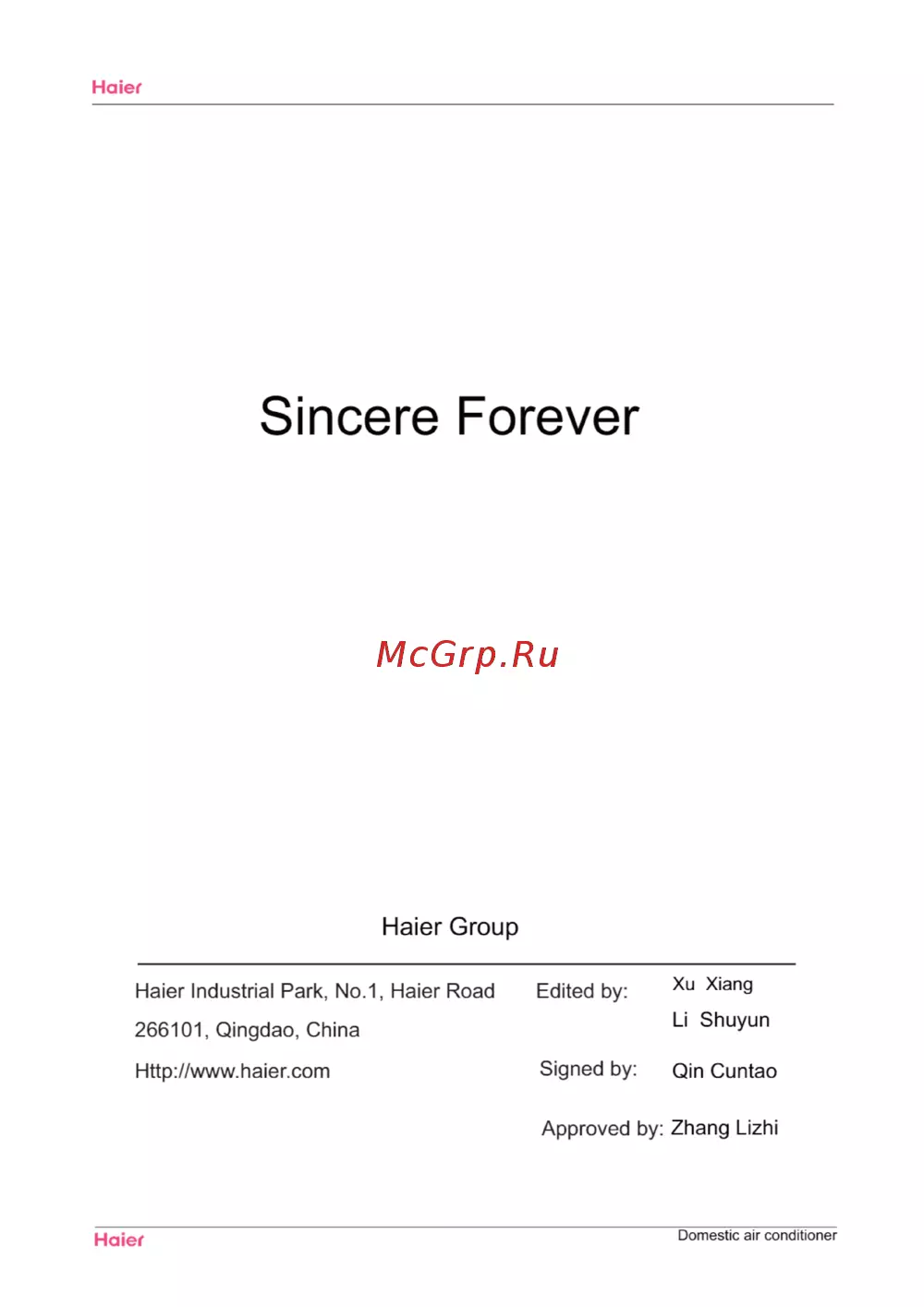 Haiei Sincere Forever Haier Group Haier Industrial Park No 1 Haier Road Edited by Xu Xiang 266101 Qingdao China Http www haier com Li Shuyun Signed by Qin Cuntao Approved by Zhang Lizhi Haier Domestic air conditioner