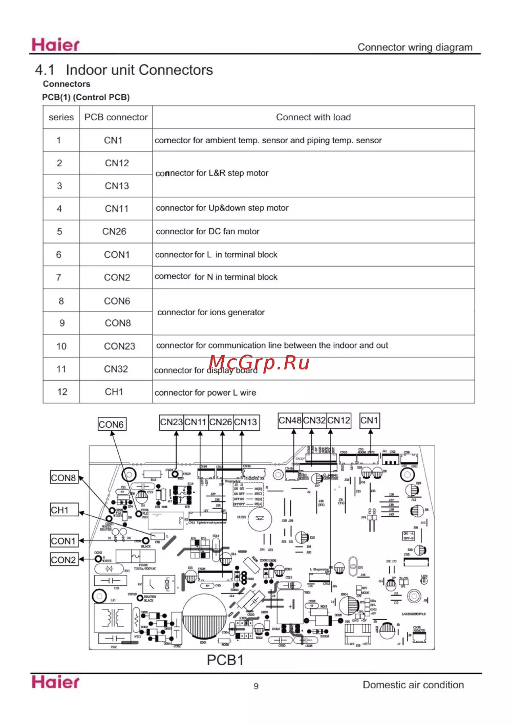 Haiei Connector wring diagram 4 1 Indoor unit Connectors Connectors PCB 1 Control PCB series PCB connector 1 CN1 2 CN12 Connect with load comector for ambient temp sensor and piping temp sensor connector for L R step motor 3 CN13 4 CN11 connector for Up down step motor 5 CN26 connector for DC fan motor 6 CON1 connector for L in terminal block 7 CON2 comector for N in terminal block 8 CON6 9 CON8 10 CON23 connector for communication line between the indoor and out 11 CN32 connector for display board 12 CH1 connector for power L wire connector for ions generator PCB1 Haier 9 Domestic air condition