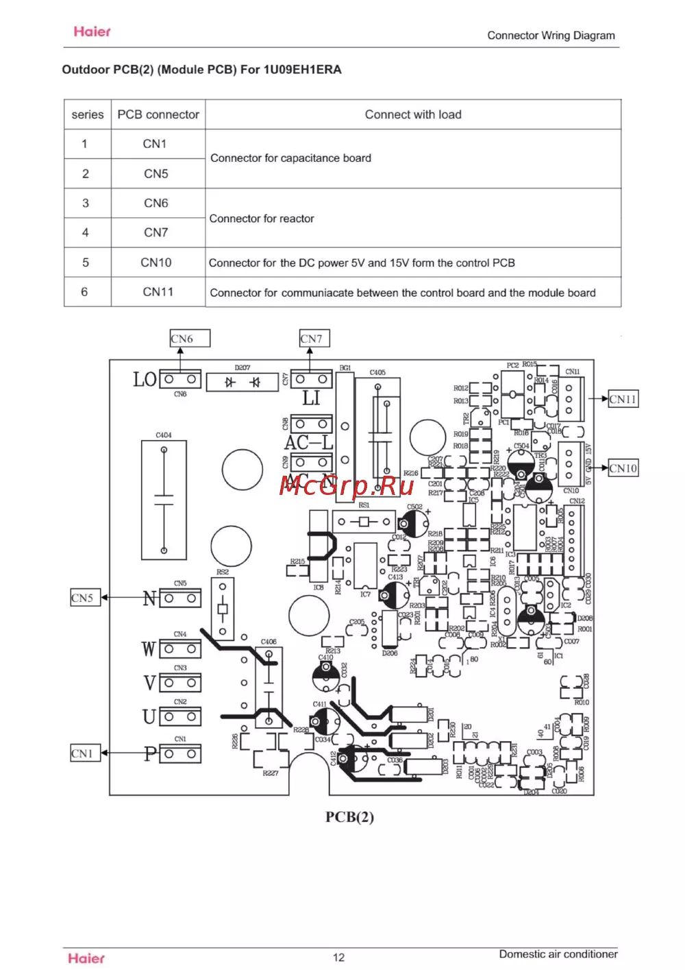 Haier Connector Wring Diagram Outdoor PCB 2 Module PCB For 1U09EH1ERA series PCB connector Connect with load 1 CN1 2 CN5 3 CN6 4 CN7 5 CN10 Connector for the DC power 5V and 15V form the control PCB 6 CN11 Connector for communiacate between the control board and the module board Connector for capacitance board Connector for reactor CN6 CN7 D207 PC2 K0 и и LO о o CNB oo LI о AC L C404 CN11 C4O5 О О О CNH О О CN10 R019 R018 О AC N e о 0201 R217 CN10 CN12 Ж SEE RS2 CN5 О О ТО о CN5 о О CN4 О W Ö Ö О О о о о о о о О IC2 огон R00 С406 R213 С410 CN3 О CN2 иОО CN1 CNl poo PCB 2 Haier 12 Domestic air conditioner