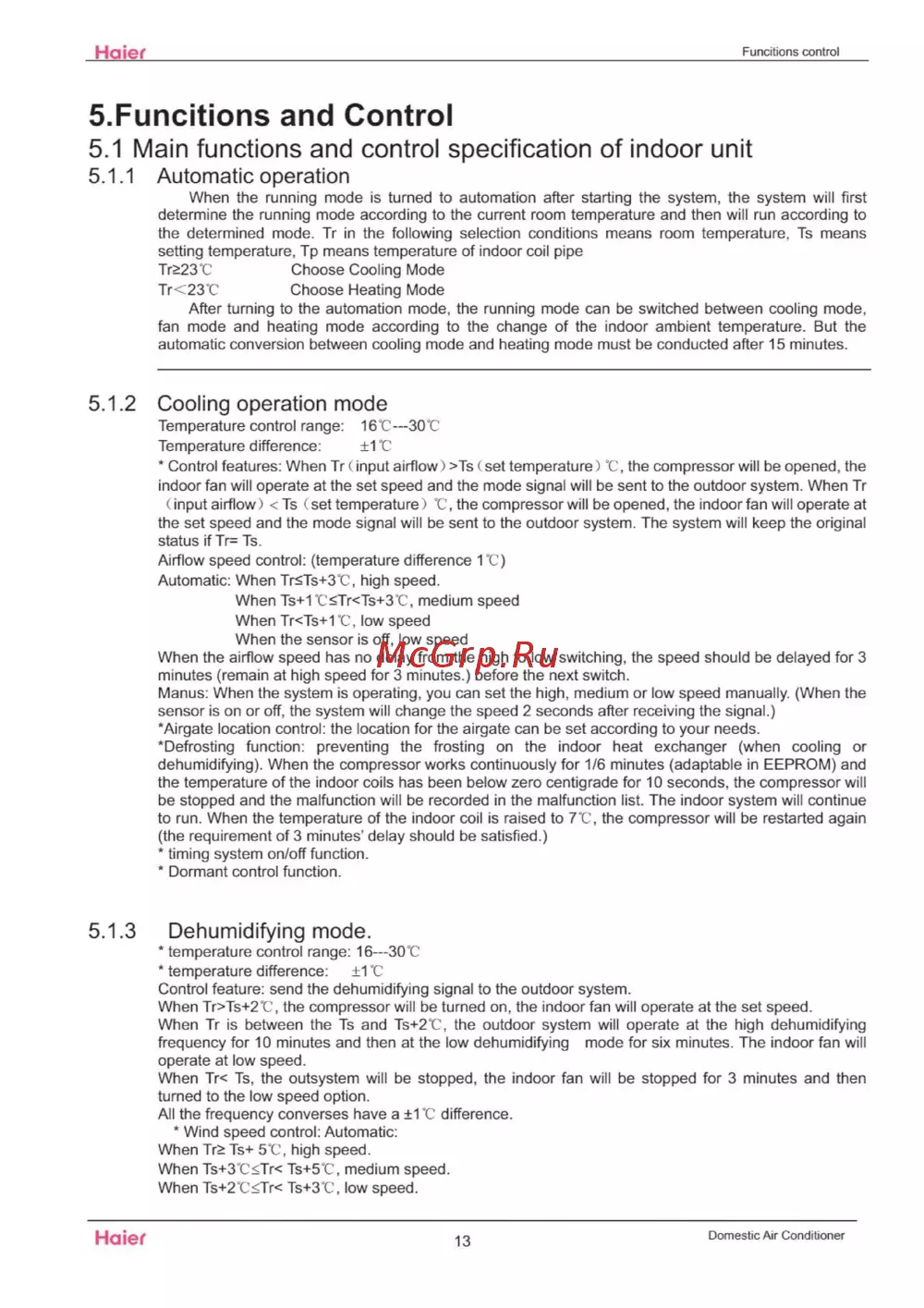 Haier Funcitions control 5 Funcitions and Control 5 1 Main functions and control specification of indoor unit 5 1 1 Automatic operation When the running mode is turned to automation after starting the system the system will first determine the running mode according to the current room temperature and then will run according to the determined mode Tr in the following selection conditions means room temperature Ts means setting temperature Tp means temperature of indoor coil pipe Choose Cooling Mode Tr 23 C Tr 23 C Choose Heating Mode After turning to the automation mode the running mode can be switched between cooling mode fan mode and heating mode according to the change of the indoor ambient temperature But the automatic conversion between cooling mode and heating mode must be conducted after 15 minutes 5 1 2 Cooling operation mode Temperature control range 16 C 30 C Temperature difference 1 C Control features When Tr input airflow Ts set temperature C the compressor will be opened the indoor fan will operate at the set speed and the mode signal will be sent to the outdoor system When Tr input airflow Ts set temperature C the compressor will be opened the indoor fan will operate at the set speed and the mode signal will be sent to the outdoor system The system will keep the original status if Tr Ts Airflow speed control temperature difference 1 C Automatic When Tr Ts 3 C high speed When Ts 1 C Tr Ts 3 C medium speed When Tr Ts 1 C low speed When the sensor is off low speed When the airflow speed has no delay from the high to low switching the speed should be delayed for 3 minutes remain at high speed for 3 minutes before the next switch Manus When the system is operating you can set the high medium or low speed manually When the sensor is on or off the system will change the speed 2 seconds after receiving the signal Airgate location control the location for the airgate can be set according to your needs Defrosting function preventing the frosting on the indoor heat exchanger when cooling or dehumidifying When the compressor works continuously for 1 6 minutes adaptable in EEPROM and the temperature of the indoor coils has been below zero centigrade for 10 seconds the compressor will be stopped and the malfunction will be recorded in the malfunction list The indoor system will continue to run When the temperature of the indoor coil is raised to 7 C the compressor will be restarted again the requirement of 3 minutes delay should be satisfied timing system on off function Dormant control function 5 1 3 Dehumidifying mode temperature control range 16 30 C temperature difference 1 C Control feature send the dehumidifying signal to the outdoor system When Tr Ts 2 C the compressor will be turned on the indoor fan will operate at the set speed When Tr is between the Ts and Ts 2 C the outdoor system will operate at the high dehumidifying frequency for 10 minutes and then at the low dehumidifying mode for six minutes The indoor fan will operate at low speed When Tr Ts the outsystem will be stopped the indoor fan will be stopped for 3 minutes and then turned to the low speed option All the frequency converses have a 1 C difference Wind speed control Automatic When TrS Ts 5 C high speed When Ts 3 C Tr Ts 5 C medium speed When Ts 2 C Tr Ts 3 C low speed Haier 13 Domestic Air Conditioner