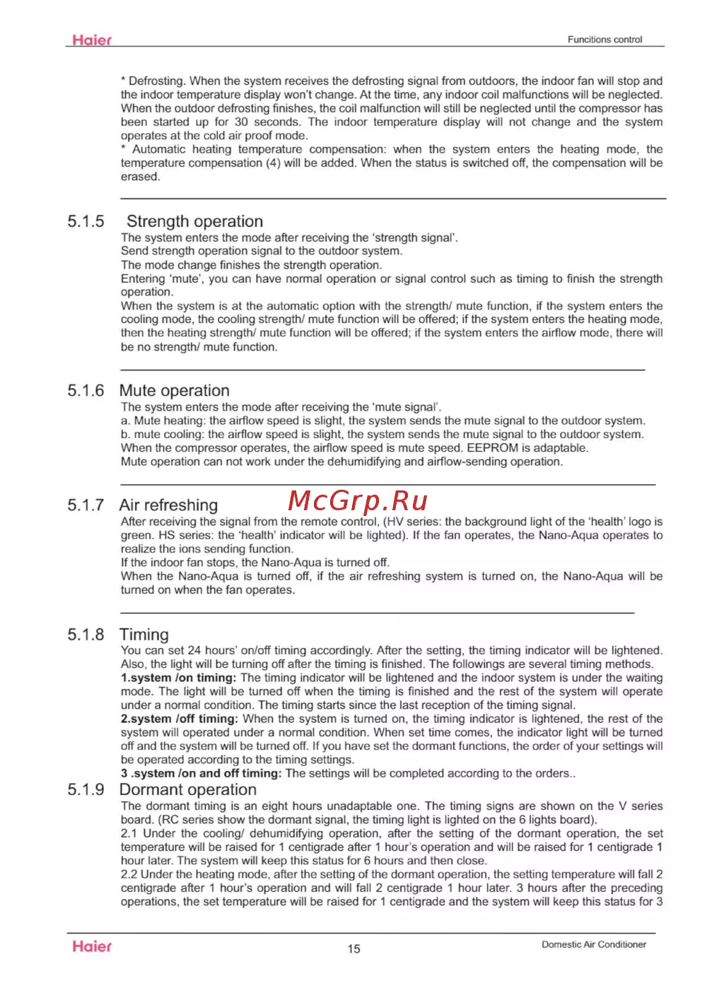 Haier Funcitions control Defrosting When the system receives the defrosting signal from outdoors the indoor fan will stop and the indoor temperature display won t change At the time any indoor coil malfunctions will be neglected When the outdoor defrosting finishes the coil malfunction will still be neglected until the compressor has been started up for 30 seconds The indoor temperature display will not change and the system operates at the cold air proof mode Automatic heating temperature compensation when the system enters the heating mode the temperature compensation 4 will be added When the status is switched off the compensation will be erased 5 1 5 Strength operation The system enters the mode after receiving the strength signal Send strength operation signal to the outdoor system The mode change finishes the strength operation Entering mute you can have normal operation or signal control such as timing to finish the strength operation When the system is at the automatic option with the strength mute function if the system enters the cooling mode the cooling strength mute function will be offered if the system enters the heating mode then the heating strength mute function will be offered if the system enters the airflow mode there will be no strength mute function 5 1 6 Mute operation The system enters the mode after receiving the mute signal a Mute heating the airflow speed is slight the system sends the mute signal to the outdoor system b mute cooling the airflow speed is slight the system sends the mute signal to the outdoor system When the compressor operates the airflow speed is mute speed EEPROM is adaptable Mute operation can not work under the dehumidifying and airflow sending operation 5 1 7 Air refreshing After receiving the signal from the remote control HV series the background light of the health logo is green HS series the health indicator will be lighted If the fan operates the Nano Aqua operates to realize the ions sending function If the indoor fan stops the Nano Aqua is turned off When the Nano Aqua is turned off if the air refreshing system is turned on the Nano Aqua will be turned on when the fan operates 5 1 8 Timing You can set 24 hours on off timing accordingly After the setting the timing indicator will be lightened Also the light will be turning off after the timing is finished The followings are several timing methods 1 system on timing The timing indicator will be lightened and the indoor system is under the waiting mode The light will be turned off when the timing is finished and the rest of the system will operate under a normal condition The timing starts since the last reception of the timing signal 2 system off timing When the system is turned on the timing indicator is lightened the rest of the system will operated under a normal condition When set time comes the indicator light will be turned off and the system will be turned off If you have set the dormant functions the order of your settings will be operated according to the timing settings 3 system on and off timing The settings will be completed according to the orders 5 1 9 Dormant operation The dormant timing is an eight hours unadaptable one The timing signs are shown on the V series board RC series show the dormant signal the timing light is lighted on the 6 lights board 2 1 Under the cooling dehumidifying operation after the setting of the dormant operation the set temperature will be raised for 1 centigrade after 1 hour s operation and will be raised for 1 centigrade 1 hour later The system will keep this status for 6 hours and then close 2 2 Under the heating mode after the setting of the dormant operation the setting temperature will fall 2 centigrade after 1 hour s operation and will fall 2 centigrade 1 hour later 3 hours after the preceding operations the set temperature will be raised for 1 centigrade and the system will keep this status for 3 Haier 15 Domestic Air Conditioner