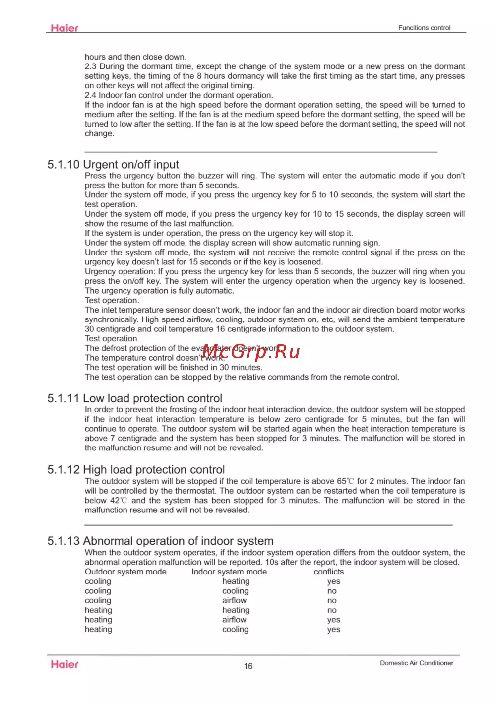 Haier Funcitions control hours and then close down 2 3 During the dormant time except the change of the system mode or a new press on the dormant setting keys the timing of the 8 hours dormancy will take the first timing as the start time any presses on other keys will not affect the original timing 2 4 Indoor fan control under the dormant operation If the indoor fan is at the high speed before the dormant operation setting the speed will be turned to medium after the setting If the fan is at the medium speed before the dormant setting the speed will be turned to low after the setting If the fan is at the low speed before the dormant setting the speed will not change 5 1 10 Urgent on off input Press the urgency button the buzzer will ring The system will enter the automatic mode if you don t press the button for more than 5 seconds Under the system off mode if you press the urgency key for 5 to 10 seconds the system will start the test operation Under the system off mode if you press the urgency key for 10 to 15 seconds the display screen will show the resume of the last malfunction If the system is under operation the press on the urgency key will stop it Under the system off mode the display screen will show automatic running sign Under the system off mode the system will not receive the remote control signal if the press on the urgency key doesn t last for 15 seconds or if the key is loosened Urgency operation If you press the urgency key for less than 5 seconds the buzzer will ring when you press the on off key The system will enter the urgency operation when the urgency key is loosened The urgency operation is fully automatic Test operation The inlet temperature sensor doesn t work the indoor fan and the indoor air direction board motor works synchronically High speed airflow cooling outdoor system on etc will send the ambient temperature 30 centigrade and coil temperature 16 centigrade information to the outdoor system Test operation The defrost protection of the evaporator doesn t work The temperature control doesn t work The test operation will be finished in 30 minutes The test operation can be stopped by the relative commands from the remote control 5 1 11 Low load protection control In order to prevent the frosting of the indoor heat interaction device the outdoor system will be stopped if the indoor heat interaction temperature is below zero centigrade for 5 minutes but the fan will continue to operate The outdoor system will be started again when the heat interaction temperature is above 7 centigrade and the system has been stopped for 3 minutes The malfunction will be stored in the malfunction resume and will not be revealed 5 1 12 High load protection control The outdoor system will be stopped if the coil temperature is above 65 C for 2 minutes The indoor fan will be controlled by the thermostat The outdoor system can be restarted when the coil temperature is below 42 C and the system has been stopped for 3 minutes The malfunction will be stored in the malfunction resume and will not be revealed 5 1 13 Abnormal operation of indoor system When the outdoor system operates if the indoor system operation differs from the outdoor system the abnormal operation malfunction will be reported 10s after the report the indoor system will be closed Outdoor system mode Indoor system mode conflicts cooling heating yes cooling cooling no cooling airflow no heating heating no heating airflow yes heating cooling yes Haier 16 Domestic Air Conditioner