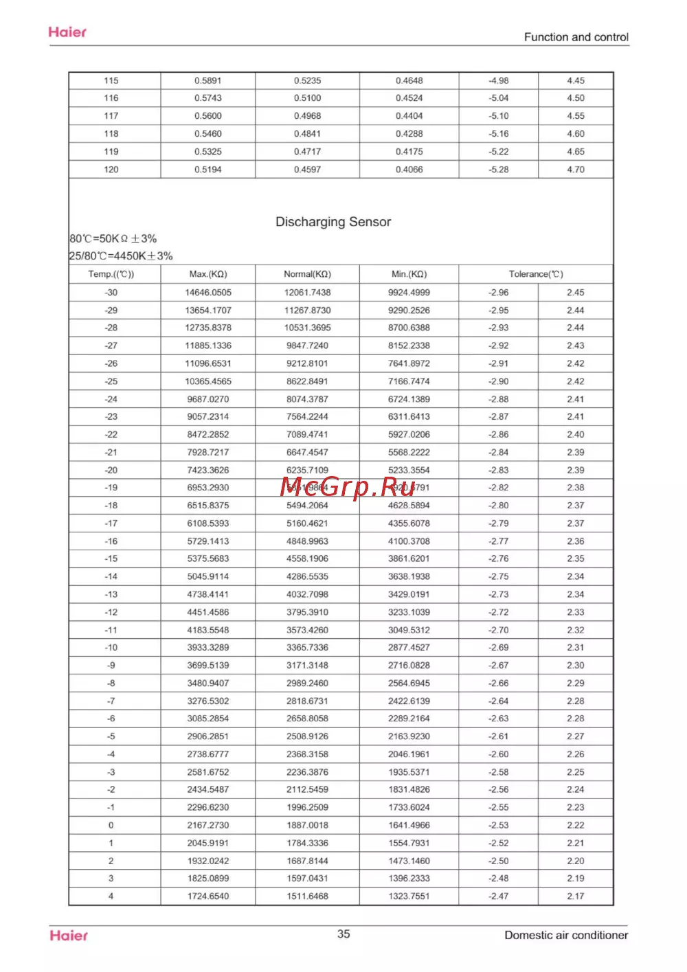Haier Function and control 115 0 5891 0 5235 0 4648 4 98 4 45 116 0 5743 0 5100 0 4524 5 04 4 50 117 0 5600 0 4968 0 4404 5 10 4 55 118 0 5460 0 4841 0 4288 5 16 4 60 119 0 5325 0 4717 0 4175 5 22 4 65 120 0 5194 0 4597 0 4066 5 28 4 70 Discharging Sensor 80 C 50KQ 3 25 80 C 4450К 3 Temp CC Max KO Normal KQ Min KO 30 14646 0505 12061 7438 9924 4999 2 96 2 45 29 13654 1707 11267 8730 9290 2526 2 95 2 44 28 12735 8378 10531 3695 8700 6388 2 93 2 44 27 11885 1336 9847 7240 8152 2338 2 92 2 43 26 11096 6531 9212 8101 7641 8972 2 91 2 42 25 10365 4565 8622 8491 7166 7474 2 90 2 42 24 9687 0270 8074 3787 6724 1389 2 88 2 41 23 9057 2314 7564 2244 6311 6413 2 87 2 41 22 8472 2852 7089 4741 5927 0206 2 86 2 40 21 7928 7217 6647 4547 5568 2222 2 84 2 39 20 7423 3626 6235 7109 5233 3554 2 83 2 39 19 6953 2930 5851 9864 4920 6791 2 82 2 38 18 6515 8375 5494 2064 4628 5894 2 80 2 37 17 6108 5393 5160 4621 4355 6078 2 79 2 37 16 5729 1413 4848 9963 4100 3708 2 77 2 36 15 5375 5683 4558 1906 3861 6201 2 76 2 35 14 5045 9114 4286 5535 3638 1938 2 75 2 34 13 4738 4141 4032 7098 3429 0191 2 73 2 34 12 4451 4586 3795 3910 3233 1039 2 72 2 33 11 4183 5548 3573 4260 3049 5312 2 70 2 32 10 3933 3289 3365 7336 2877 4527 2 69 2 31 9 3699 5139 3171 3148 2716 0828 2 67 2 30 8 3480 9407 2989 2460 2564 6945 2 66 2 29 7 3276 5302 2818 6731 2422 6139 2 64 2 28 6 3085 2854 2658 8058 2289 2164 2 63 2 28 5 2906 2851 2508 9126 2163 9230 2 61 2 27 4 2738 6777 2368 3158 2046 1961 2 60 2 26 3 2581 6752 2236 3876 1935 5371 2 58 2 25 2 2434 5487 2112 5459 1831 4826 2 56 2 24 1 2296 6230 1996 2509 1733 6024 2 55 2 23 0 2167 2730 1887 0018 1641 4966 2 53 2 22 1 2045 9191 1784 3336 1554 7931 2 52 2 21 2 1932 0242 1687 8144 1473 1460 2 50 2 20 3 1825 0899 1597 0431 1396 2333 2 48 2 19 4 1724 6540 1511 6468 1323 7551 2 47 2 17 Haier 35 TolerancefC Domestic air conditioner