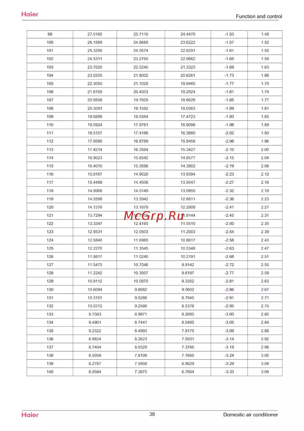 Haier Haier Function and control 99 27 0160 25 7110 24 4470 1 53 1 48 100 26 1569 24 8685 23 6222 1 57 1 52 101 25 3290 24 0574 22 8291 1 61 1 55 102 24 5311 23 2765 22 0662 1 65 1 59 103 23 7620 22 5245 21 3323 1 69 1 63 104 23 0205 21 8002 20 6261 1 73 1 66 105 22 3055 21 1025 19 9465 1 77 1 70 106 21 6159 20 4303 19 2924 1 81 1 74 107 20 9508 19 7825 18 6626 1 85 1 77 108 20 3091 19 1582 18 0563 1 89 1 81 109 19 6899 18 5564 17 4723 1 93 1 85 110 19 0924 17 9761 16 9098 1 98 1 89 111 18 5157 17 4166 16 3680 2 02 1 93 112 17 9590 16 8769 15 8458 2 06 1 96 113 17 4214 16 3564 15 3427 2 10 2 00 114 16 9023 15 8542 14 8577 2 15 2 04 115 16 4010 15 3696 14 3902 2 19 2 08 116 15 9167 14 9020 13 9394 2 23 2 12 117 15 4489 14 4506 13 5047 2 27 2 16 118 14 9968 14 0149 13 0855 2 32 2 19 119 14 5599 13 5942 12 6811 2 36 2 23 120 14 1376 13 1879 12 2909 2 41 2 27 121 13 7294 12 7955 11 9144 2 45 2 31 122 13 3347 12 4165 11 5510 2 50 2 35 123 12 9531 12 0503 11 2003 2 54 2 39 124 12 5840 11 6965 10 8617 2 58 2 43 125 12 2270 11 3545 10 5348 2 63 2 47 126 11 8817 11 0240 10 2191 2 68 2 51 127 11 5475 10 7046 9 9142 2 72 2 55 128 11 2242 10 3957 9 6197 2 77 2 59 129 10 9112 10 0970 9 3352 2 81 2 63 130 10 6084 9 8082 9 0602 2 86 2 67 131 10 3151 9 5288 8 7945 2 91 2 71 132 10 0312 9 2586 8 5378 2 95 2 75 133 9 7563 8 9971 8 2895 3 00 2 80 134 9 4901 8 7441 8 0495 3 05 2 84 135 9 2322 8 4993 7 8175 3 09 2 88 136 8 9824 8 2623 7 5931 3 14 2 92 137 8 7404 8 0329 7 3760 3 19 2 96 138 8 5059 7 8108 7 1660 3 24 3 00 139 8 2787 7 5958 6 9629 3 29 3 04 140 8 0584 7 3875 6 7664 3 33 3 09 38 Domestic air conditioner