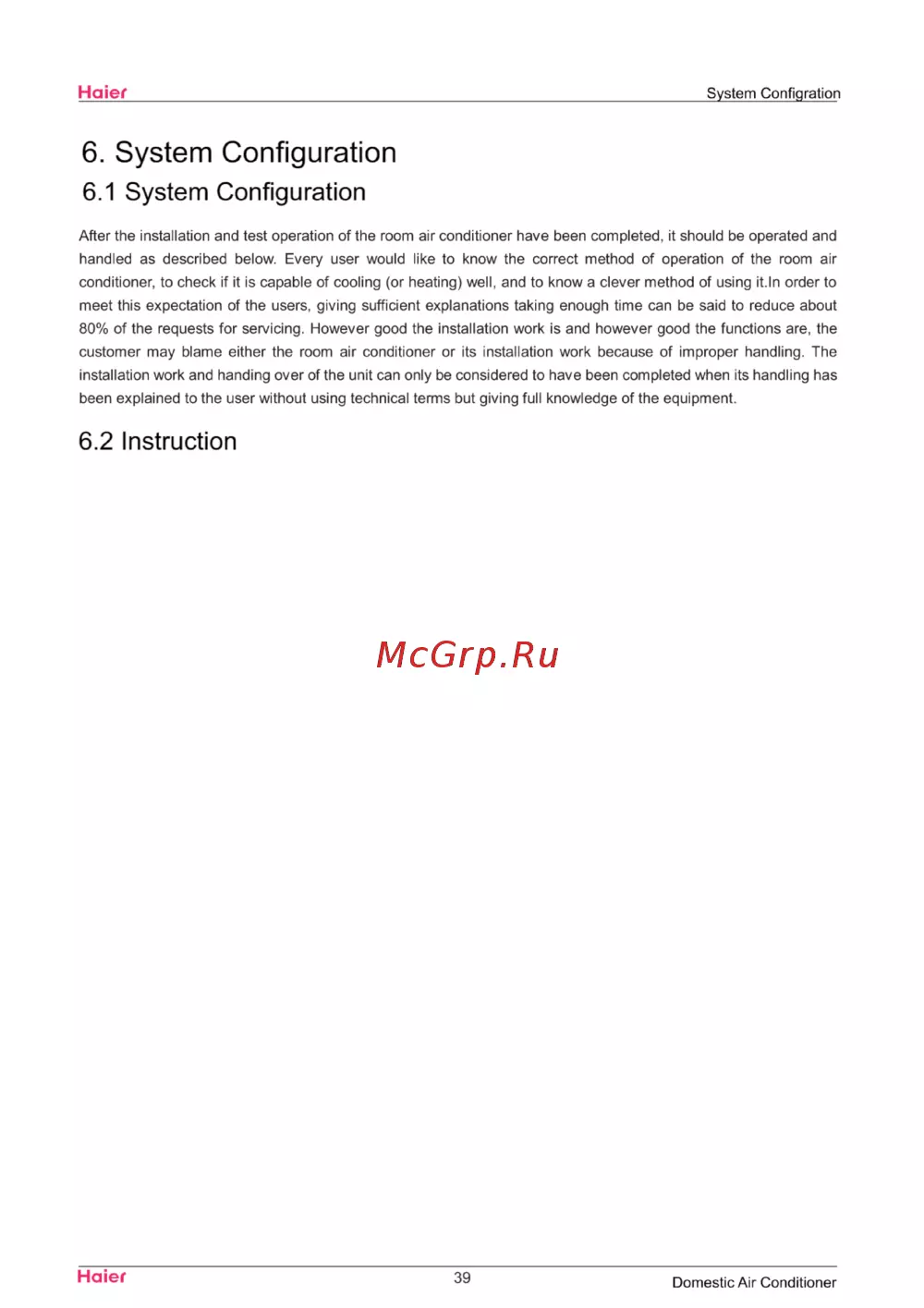 Haier System Configration 6 System Configuration 6 1 System Configuration After the installation and test operation of the room air conditioner have been completed it should be operated and handled as described below Every user would like to know the correct method of operation of the room air conditioner to check if it is capable of cooling or heating well and to know a clever method of using it ln order to meet this expectation of the users giving sufficient explanations taking enough time can be said to reduce about 80 of the requests for servicing However good the installation work is and however good the functions are the customer may blame either the room air conditioner or its installation work because of improper handling The installation work and handing over of the unit can only be considered to have been completed when its handling has been explained to the user without using technical terms but giving full knowledge of the equipment 6 2 Instruction Haier 39 Domestic Air Conditioner