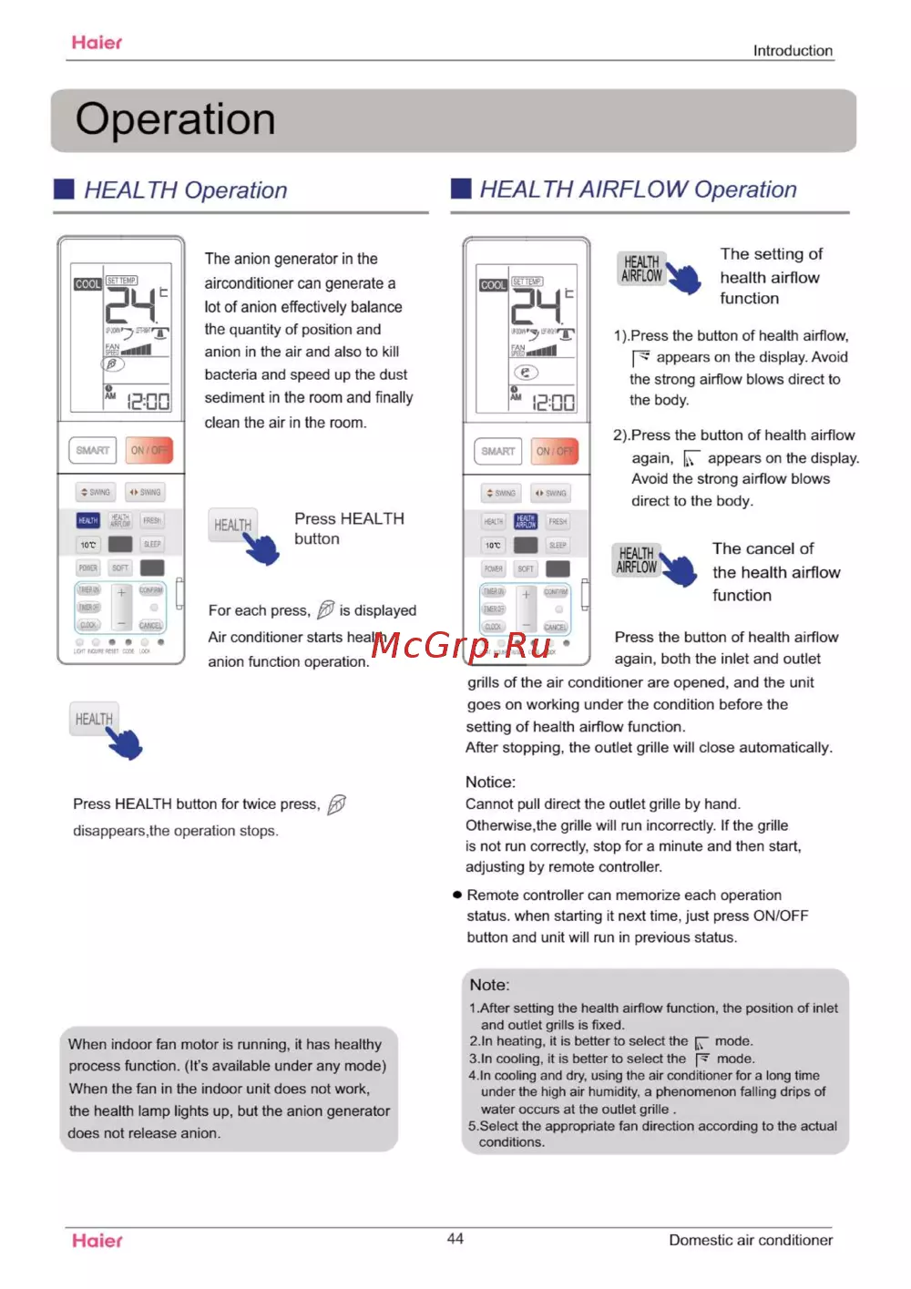 Haier Introduction Operation HEALTH AIRFLOW Operation HEALTH Operation The anion generator in the HEALTH AIRFLOW airconditioner can generate a lot of anion effectively balance the quantity of position and The setting of health airflow function 1 Press the button of health airflow anion in the air and also to kill p appears on the display Avoid bacteria and speed up the dust the strong airflow blows direct to the body sediment in the room and finally clean the air in the room 2 Press the button of health airflow again P appears on the display Avoid the strong airflow blows direct to the body Press HEALTH button The cancel of the health airflow function For each press is displayed Air conditioner starts health Press the button of health airflow anion function operation again both the inlet and outlet grills of the air conditioner are opened and the unit goes on working under the condition before the HEALT setting of health airflow function After stopping the outlet grille will close automatically Notice Press HEALTH button for twice press Cannot pull direct the outlet grille by hand disappears the operation stops Otherwise the grille will run incorrectly If the grille is not run correctly stop for a minute and then start adjusting by remote controller Remote controller can memorize each operation status when starting it next time just press ON OFF button and unit will run in previous status Note 1 After setting the health airflow function the position of inlet and outlet grills is fixed 2 In heating it is better to select the 7 mode 3 ln cooling it is better to select the p mode 4 In cooling and dry using the air conditioner for a long time under the high air humidity a phenomenon falling drips of water occurs at the outlet grille 5 Select the appropriate fan direction according to the actual conditions When indoor fan motor is running it has healthy process function It s available under any mode When the fan in the indoor unit does not work the health lamp lights up but the anion generator does not release anion Haier 44 Domestic air conditioner