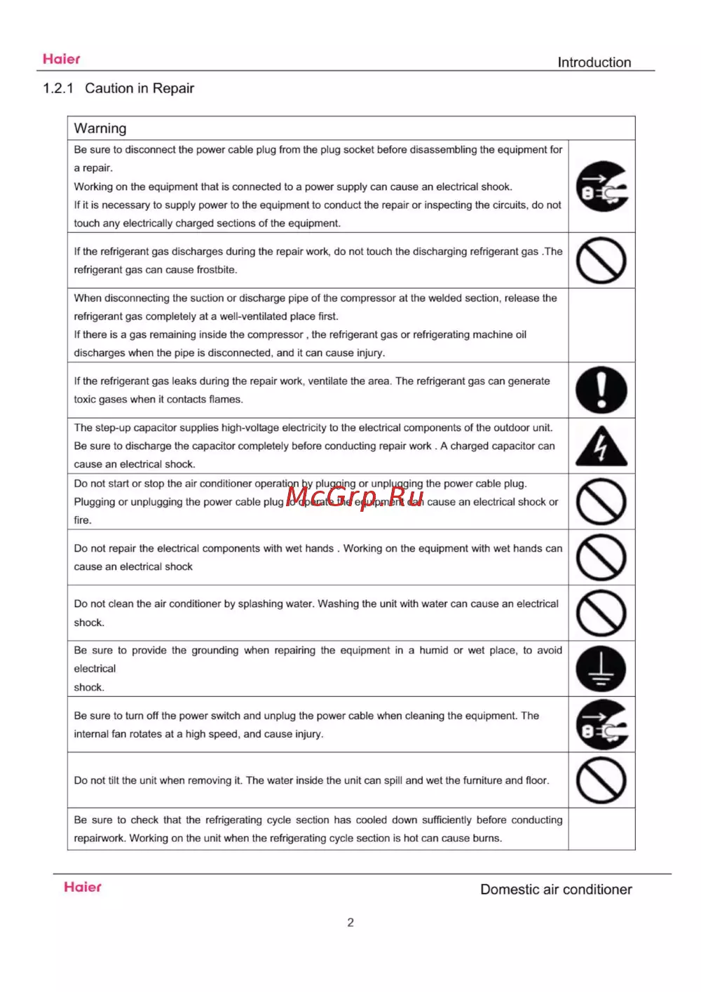 Haief Introduction 1 2 1 Caution in Repair Warning Be sure to disconnect the power cable plug from the plug socket before disassembling the equipment for a repair Working on the equipment that is connected to a power supply can cause an electrical shook If it is necessary to supply power to the equipment to conduct the repair or inspecting the circuits do not touch any electrically charged sections of the equipment e If the refrigerant gas discharges during the repair work do not touch the discharging refrigerant gas The refrigerant gas can cause frostbite When disconnecting the suction or discharge pipe of the compressor at the welded section release the refrigerant gas completely at a well ventilated place first If there is a gas remaining inside the compressor the refrigerant gas or refrigerating machine oil discharges when the pipe is disconnected and it can cause injury If the refrigerant gas leaks during the repair work ventilate the area The refrigerant gas can generate toxic gases when it contacts flames The step up capacitor supplies high voltage electricity to the electrical components of the outdoor unit о Be sure to discharge the capacitor completely before conducting repair work A charged capacitor can cause an electrical shock Do not start or stop the air conditioner operation by plugging or unplugging the power cable plug Plugging or unplugging the power cable plug to operate the equipment can cause an electrical shock or fire Do not repair the electrical components with wet hands Working on the equipment with wet hands can cause an electrical shock Do not clean the air conditioner by splashing water Washing the unit with water can cause an electrical shock Be sure to provide the grounding when repairing the equipment in a humid or wet place to avoid electrical shock Be sure to turn off the power switch and unplug the power cable when cleaning the equipment The internal fan rotates at a high speed and cause injury Do not tilt the unit when removing it The water inside the unit can spill and wet the furniture and floor Be sure to check that the refrigerating cycle section has cooled down sufficiently before conducting repairwork Working on the unit when the refrigerating cycle section is hot can cause burns Haier Domestic air conditioner 2