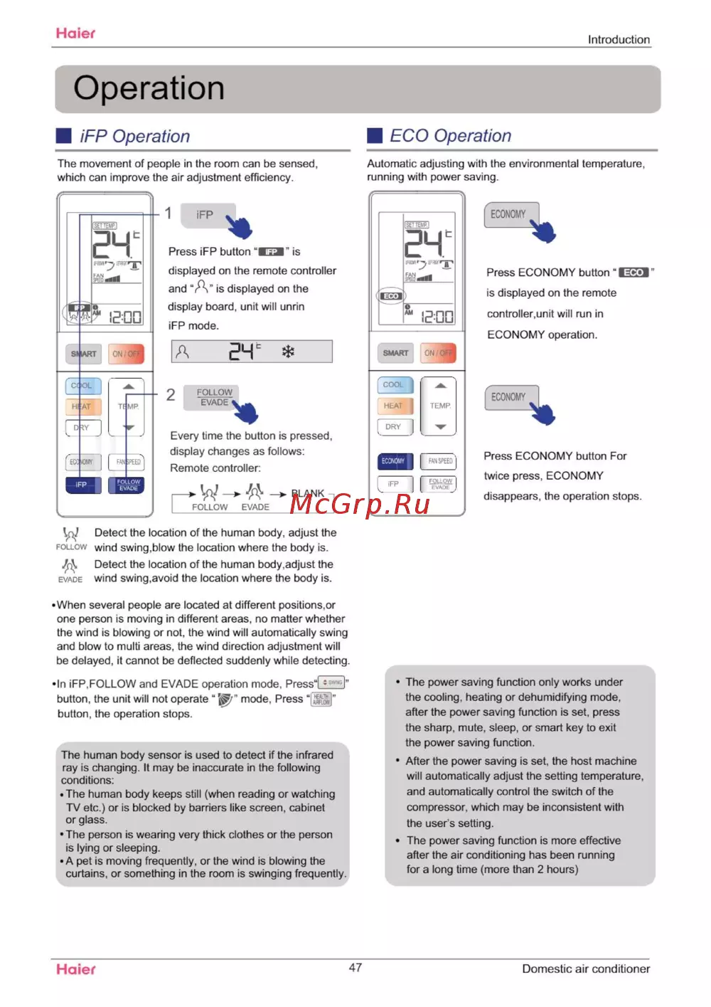 Haier Introduction Operation I ECO Operation iFP Operation The movement of people in the room can be sensed which can improve the air adjustment efficiency Automatic adjusting with the environmental temperature running with power saving Press iFP button lii is displayed on the remote controller Press ECONOMY button E51 and A is displayed on the is displayed on the remote display board unit will unrin controller unit will run in iFP mode ECONOMY operation A Every time the button is pressed display changes as follows Press ECONOMY button For Remote controller twice press ECONOMY BLANK EVADE disappears the operation stops LQJ Detect the location of the human body adjust the wind swing blow the location where the body is FOLLOW EVADE Detect the location of the human body adjust the wind swing avoid the location where the body is When several people are located at different positions or one person is moving in different areas no matter whether the wind is blowing or not the wind will automatically swing and blow to multi areas the wind direction adjustment will be delayed it cannot be deflected suddenly while detecting The power saving function only works under the cooling heating or dehumidifying mode after the power saving function is set press the sharp mute sleep or smart key to exit the power saving function In iFP FOLLOW and EVADE operation mode Press 1 button the unit will not operate mode Press jS button the operation stops The human body sensor is used to detect if the infrared ray is changing It may be inaccurate in the following conditions The human body keeps still when reading or watching TV etc or is blocked by barriers like screen cabinet or glass The person is wearing very thick clothes or the person is lying or sleeping A pet is moving frequently or the wind is blowing the curtains or something in the room is swinging frequently Haier After the power saving is set the host machine will automatically adjust the setting temperature and automatically control the switch of the compressor which may be inconsistent with the user s setting The power saving function is more effective after the air conditioning has been running for a long time more than 2 hours 47 Domestic air conditioner