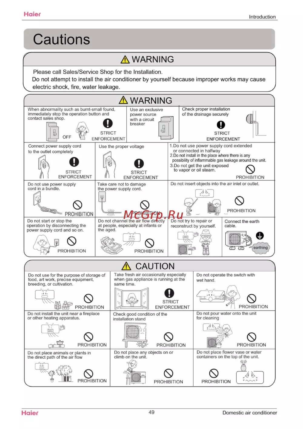 Haier Introduction Cautions A WARNING Please call Sales Service Shop for the Installation Do not attempt to install the air conditioner by yourself because improper works may cause electric shock fire water leakage A WARNING When abnormality such as burnt small found immediately stop the operation button and contact sales shop Check proper installation of the drainage securely Use an exclusive power source with a circuit breaker o STRICT STRICT ENFORCEMENT Connect power supply cord to the outlet completely ENFORCEMENT 1 Do not use power supply cord extended or connected in halfway 2 Do not install in the place where there is any possibility of inflammable gas leakage around the unit 3 Do not get the unit exposed C to vapor or oil steam Use the proper voltage STRICT ENFORCEMENT PROHIBITION Do not insert objects into the air inlet or outlet Do not use power supply cord in a bundle Take care not to damage the power supply cord Do not start or stop the operation by disconnecting the power supply cord and so on Do not channel the air flow directly at people especially at infants or the aged A CAUTION Do not use for the purpose of storage of food art work precise equipment breeding or cultivation Take fresh air occasionally especially when gas appliance is running at the same time Do not operate the switch with wet hand STRICT ENFORCEMENT Do not install the unit near a fireplace or other heating apparatus Check good condition of the installation stand Do not pour water onto the unit for cleaning Do not place animals or plants in the direct path of the air flow Do not place any objects on or climb on the unit Do not place flower vase or water containers on the top of the unit Haier 49 Domestic air conditioner