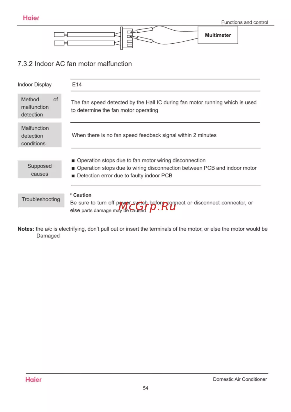 Haiei Functions and control 7 3 2 Indoor AC fan motor malfunction Indoor Display E14 Method of malfunction detection The fan speed detected by the Hall IC during fan motor running which is used to determine the fan motor operating Malfunction detection When there is no fan speed feedback signal within 2 minutes conditions Operation stops due to fan motor wiring disconnection Supposed causes Troubleshooting Operation stops due to wiring disconnection between PCB and indoor motor Detection error due to faulty indoor PCB Caution Be sure to turn off power switch before connect or disconnect connector or else parts damage may be caused Notes the a c is electrifying don t pull out or insert the terminals of the motor or else the motor would be Damaged Haier Domestic Air Conditioner 54