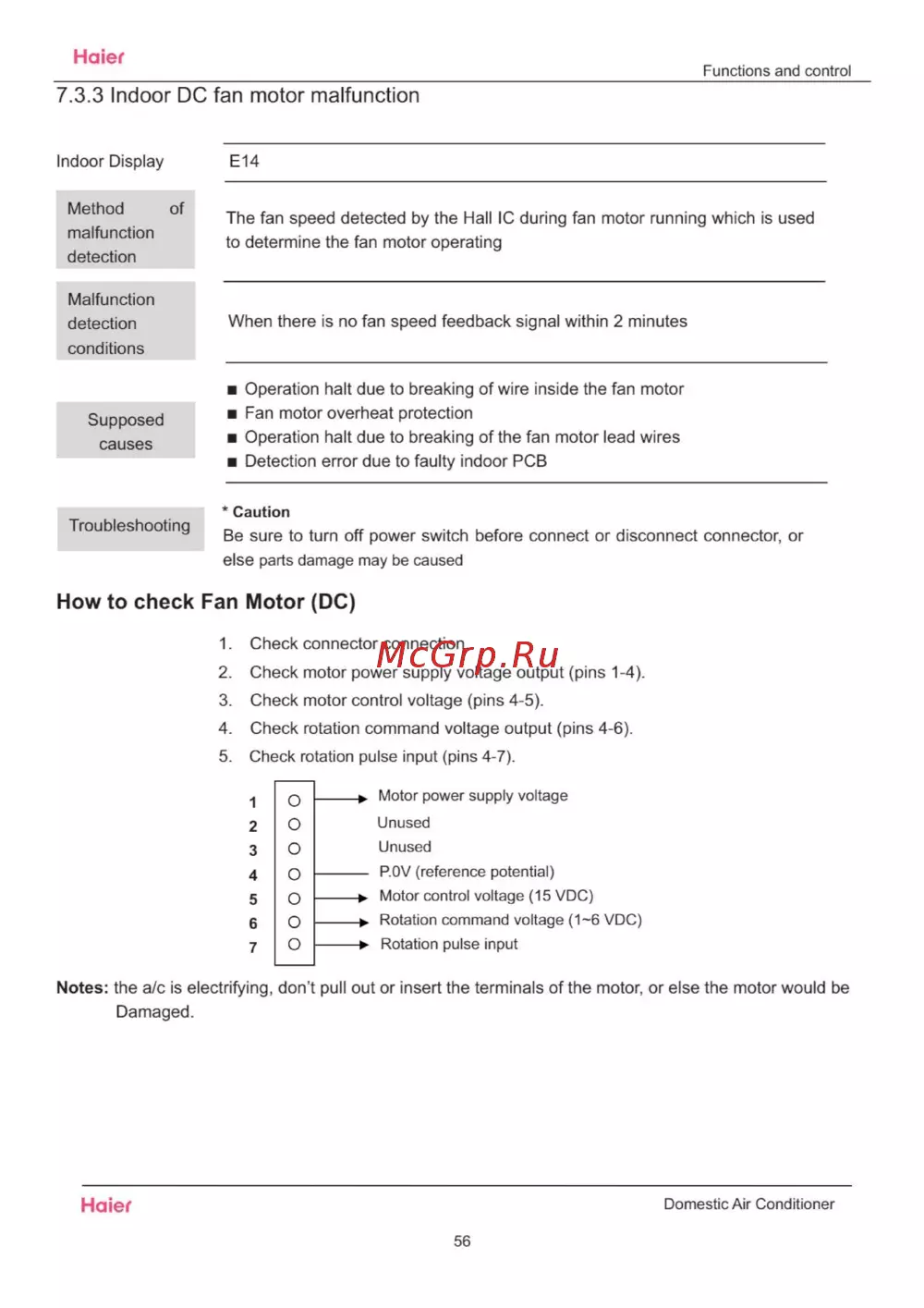 Haier Functions and control 7 3 3 Indoor DC fan motor malfunction Indoor Display Method of malfunction E14 The fan speed detected by the Hall IC during fan motor running which is used to determine the fan motor operating detection Malfunction detection When there is no fan speed feedback signal within 2 minutes conditions Operation halt due to breaking of wire inside the fan motor Supposed causes Fan motor overheat protection Operation halt due to breaking of the fan motor lead wires Detection error due to faulty indoor PCB Troubleshooting Caution Be sure to turn off power switch before connect or disconnect connector or else parts damage may be caused How to check Fan Motor DC 1 Check connector connection 2 Check motor power supply voltage output pins 1 4 3 Check motor control voltage pins 4 5 4 Check rotation command voltage output pins 4 6 5 Check rotation pulse input pins 4 7 1 2 3 4 5 6 7 о о о о о о о Motor power supply voltage Unused Unused P OV reference potential k Motor control voltage 15 VDC Rotation command voltage 1 6 VDC Rotation pulse input Notes the a c is electrifying don t pull out or insert the terminals of the motor or else the motor would be Damaged Haier Domestic Air Conditioner 56