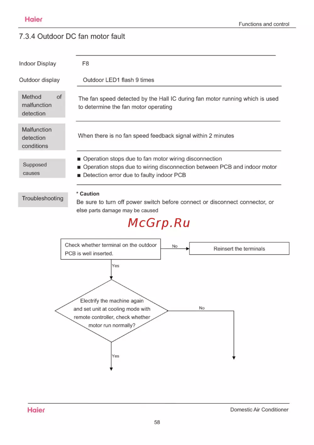 Haiei Functions and control 7 3 4 Outdoor DC fan motor fault Indoor Display F8 Outdoor display Outdoor LED1 flash 9 times Method of The fan speed detected by the Hall IC during fan motor running which is used malfunction to determine the fan motor operating detection Malfunction detection When there is no fan speed feedback signal within 2 minutes conditions Operation stops due to fan motor wiring disconnection Supposed Operation stops due to wiring disconnection between PCB and indoor motor causes Detection error due to faulty indoor PCB Troubleshooting Caution Be sure to turn off power switch before connect or disconnect connector or else parts damage may be caused Haier Domestic Air Conditioner 58