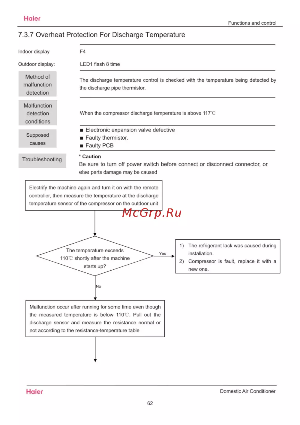 Haier Functions and control 7 3 7 Overheat Protection For Discharge Temperature Indoor display F4 Outdoor display LED1 flash 8 time Method of malfunction The discharge temperature control is checked with the temperature being detected by the discharge pipe thermistor detection Malfunction detection When the compressor discharge temperature is above 117 C conditions Electronic expansion valve defective Supposed causes Troubleshooting Faulty thermistor Faulty PCB Caution Be sure to turn off power switch before connect or disconnect connector or else parts damage may be caused Haier Domestic Air Conditioner 62