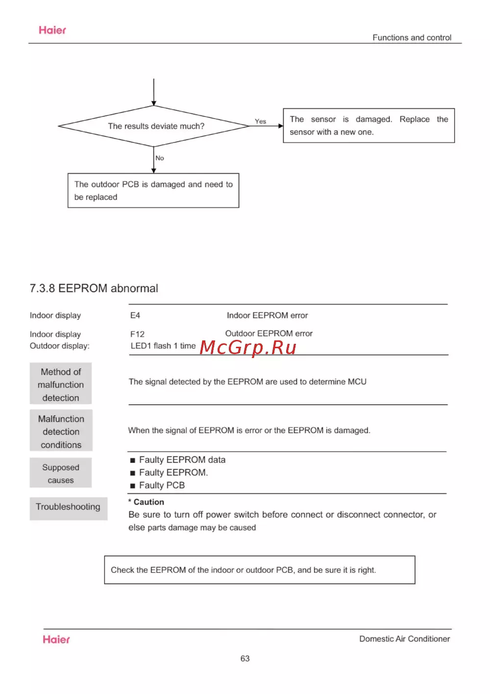 Haiei Functions and control 7 3 8 EEPROM abnormal Indoor display E4 Indoor EEPROM error Indoor display F12 Outdoor EEPROM error Outdoor display LED1 flash 1 time Method of malfunction The signal detected by the EEPROM are used to determine MCU detection Malfunction detection When the signal of EEPROM is error or the EEPROM is damaged conditions Faulty EEPROM data Supposed causes Troubleshooting Faulty EEPROM Faulty PCB Caution Be sure to turn off power switch before connect or disconnect connector or else parts damage may be caused Check the EEPROM of the indoor or outdoor PCB and be sure it is right Haier Domestic Air Conditioner 63
