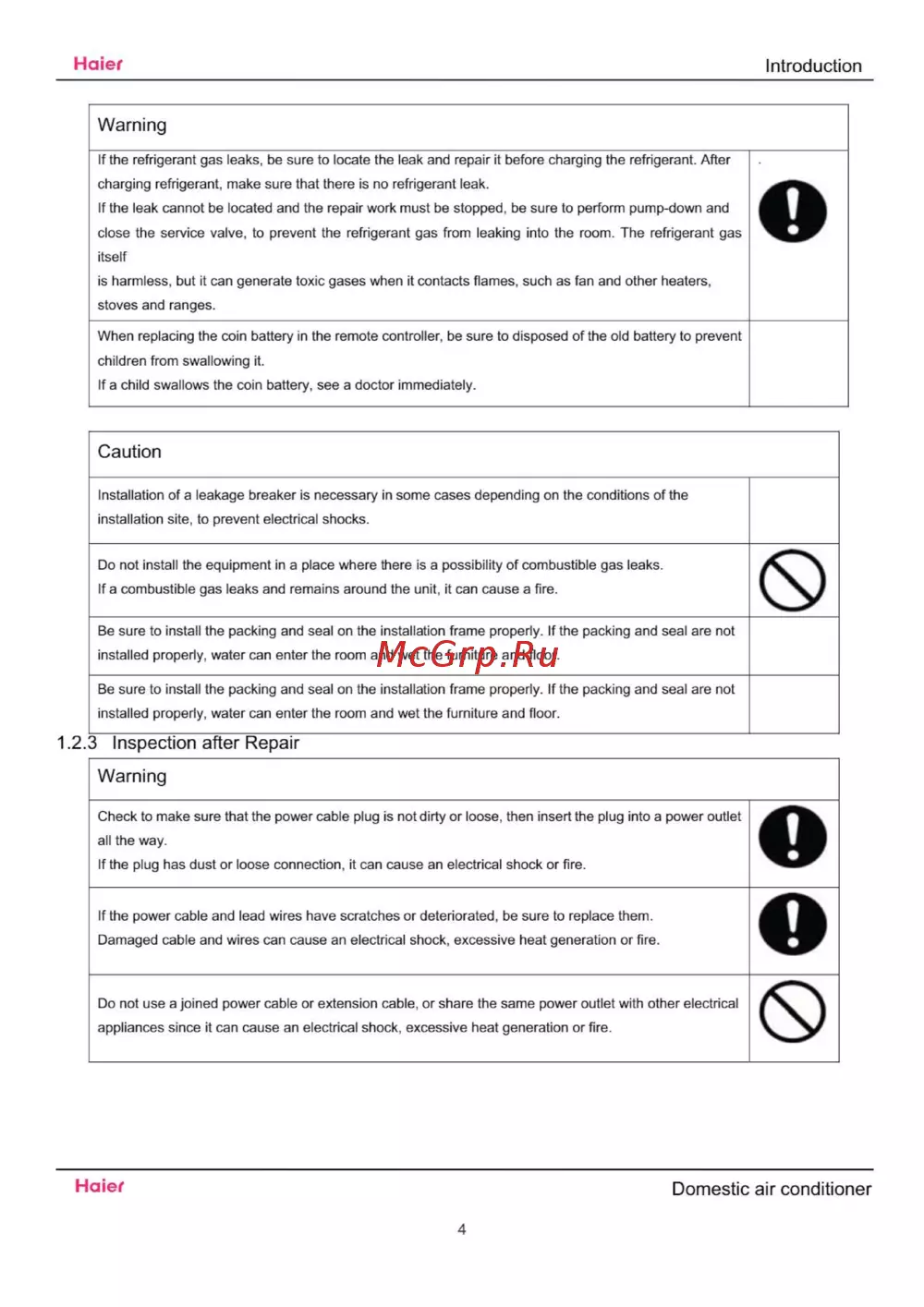 Haief Introduction Warning If the refrigerant gas leaks be sure to locate the leak and repair it before charging the refrigerant After charging refrigerant make sure that there is no refrigerant leak If the leak cannot be located and the repair work must be stopped be sure to perform pump down and close the service valve to prevent the refrigerant gas from leaking into the room The refrigerant gas itself о is harmless but it can generate toxic gases when it contacts flames such as fan and other heaters stoves and ranges When replacing the coin battery in the remote controller be sure to disposed of the old battery to prevent children from swallowing it If a child swallows the coin battery see a doctor immediately Caution Installation of a leakage breaker is necessary in some cases depending on the conditions of the installation site to prevent electrical shocks Do not install the equipment in a place where there is a possibility of combustible gas leaks If a combustible gas leaks and remains around the unit it can cause a fire Be sure to install the packing and seal on the installation frame properly If the packing and seal are not installed properly water can enter the room and wet the furniture and floor Be sure to install the packing and seal on the installation frame properly If the packing and seal are not installed properly water can enter the room and wet the furniture and floor 1 2 3 Inspection after Repair Warning Check to make sure that the power cable plug is not dirty or loose then insert the plug into a power outlet all the way If the plug has dust or loose connection it can cause an electrical shock or fire If the power cable and lead wires have scratches or deteriorated be sure to replace them Damaged cable and wires can cause an electrical shock excessive heat generation or fire о о Do not use a joined power cable or extension cable or share the same power outlet with other electrical appliances since it can cause an electrical shock excessive heat generation or fire Haier Domestic air conditioner 4