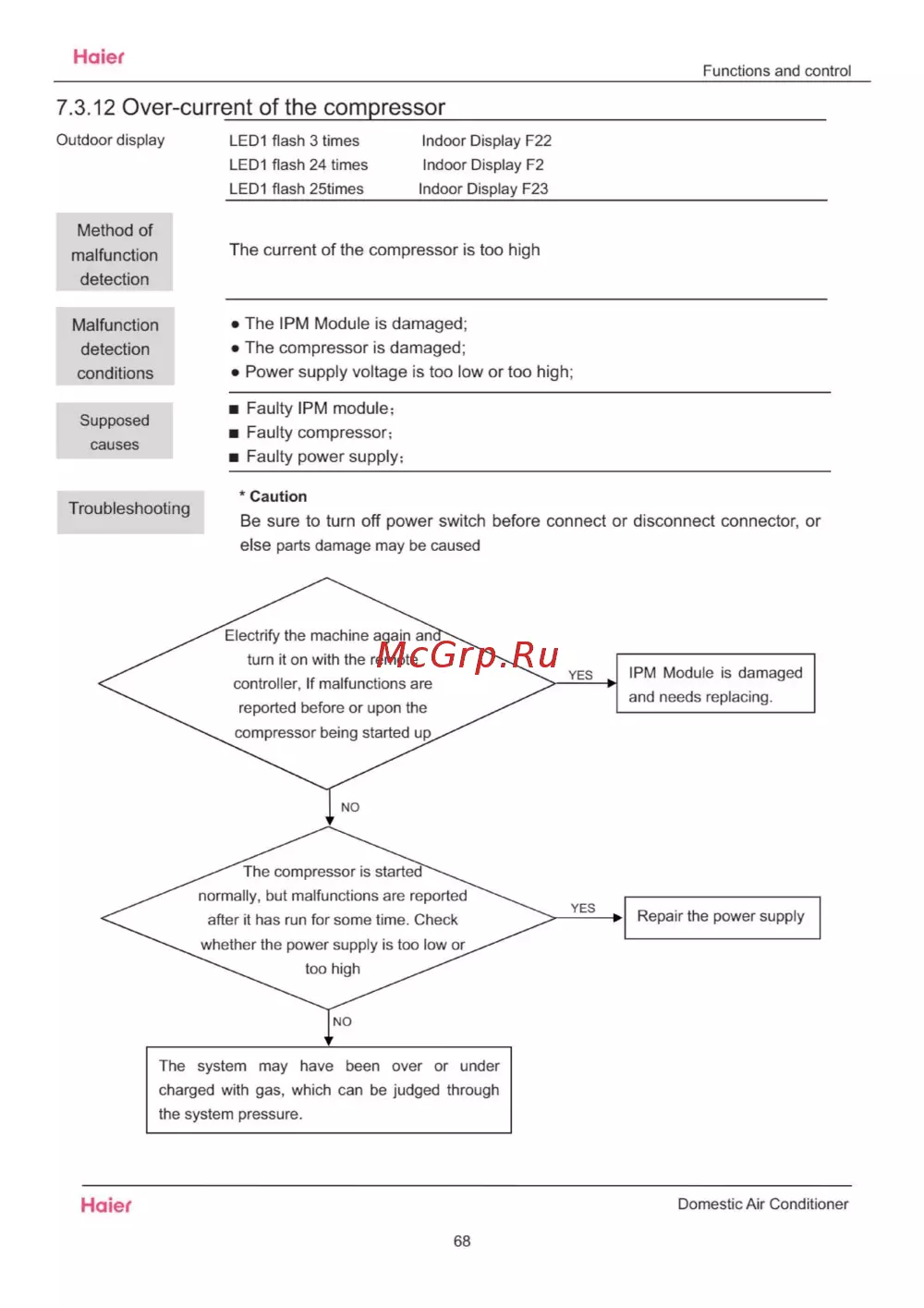 Haiei Functions and control 7 3 12 Over current of the compressor Outdoor display LED1 flash 3 times Indoor Display F22 LED1 flash 24 times Indoor Display F2 LED1 flash 25times Indoor Display F23 Method of malfunction The current of the compressor is too high detection Malfunction The IPM Module is damaged detection The compressor is damaged conditions Power supply voltage is too low or too high Supposed causes Troubleshooting Faulty IPM module Faulty compressor Faulty power supply Caution Be sure to turn off power switch before connect or disconnect connector or else parts damage may be caused Haier Domestic Air Conditioner 68