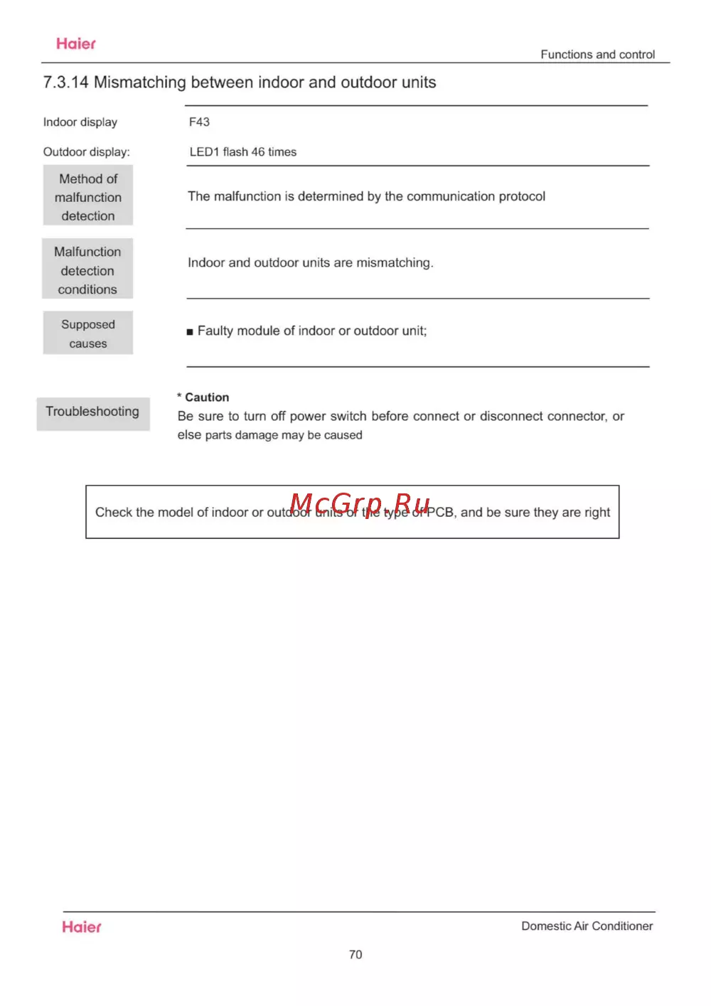 Haiei Functions and control 7 3 14 Mismatching between indoor and outdoor units Indoor display F43 Outdoor display LED1 flash 46 times Method of malfunction The malfunction is determined by the communication protocol detection Malfunction Indoor and outdoor units are mismatching detection conditions Supposed Faulty module of indoor or outdoor unit causes Caution Troubleshooting Be sure to turn off power switch before connect or disconnect connector or else parts damage may be caused Check the model of indoor or outdoor units or the type of PCB and be sure they are right Haier Domestic Air Conditioner 70