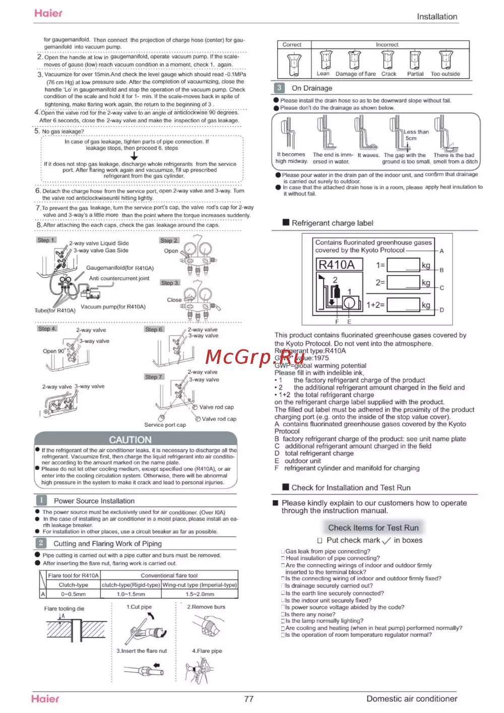 Haier Installation for gaugemanifold Then connect the projection of charge hose center for gau gemanifold into vacuum pump 2 Open the handle at low in gaugemanifold operate vacuum pump If the scale moves of gause low reach vacuum condition in a moment check 1 again 3 Vacuumize for over 15min And check the level gauge which should read 0 1 MPa 76 cm Hg at low pressure side After the completion of vacuumizing close the On Drainage handle Lo in gaugemanifold and stop the operation of the vacuum pump Check condition of the scale and hold it for 1 min If the scale moves back in spite of Please install the drain hose so as to be downward slope without fail tightening make flaring work again the return to the beginning of 3 Please don t do the drainage as shown below 4 Open the valve rod for the 2 way valve to an angle of anticlockwise 90 degrees After 6 seconds close the 2 way valve and make the inspection of gas leakage I 5 No gas leakage In case of gas leakage tighten parts of pipe connection If leakage stops then proceed 6 steps If it does not stop gas leakage discharge whole refrigerants from the service port After flaring work again and vacuumize fill up prescribed refrigerant from the gas cylinder Please pour water in the drain pan of the indoor unit and confirm that drainage is carried out surely to outdoor In case that the attached drain hose is in a room please apply heat insulation 6 Detach the charge hose from the service port open 2 way valve and 3 way Turn it without fail the valve rod anticlockwiseuntil hitting lightly 9 7 To prevent the gas leakage turn the service port s cap the valve rod s cap for 2 way valve and 3 way s a little more than the point where the torque increases suddenly Refrigerant charge label 8 After attaching the each caps check the gas leakage around the caps CAUTION If the refrigerant of the air conditioner leaks it is necessary to discharge all the refrigerant Vacuumize first then charge the liquid refrigerant into air conditio ner according to the amount marked on the name plate Please do not let other cooling medium except specified one R410A or air enter into the cooling circulation system Otherwise there will be abnormal k high pressure in the system to make it crack and lead to personal injuries u Power Source Installation The power source must be exclusively used for air conditioner Over I0A In the case of installing an air conditioner in a moist place please install an ea rth leakage breaker For installation in other places use a circuit breaker as far as possible a Cutting and Flaring Work of Piping Check for Installation and Test Run Please kindly explain to our customers how to operate through the instruction manual Check Items for Test Run U Put check mark in boxes Gas leak from pipe connecting Heat insulation of pipe connecting Are the connecting wirings of indoor and outdoor firmly inserted to the terminal block Is the connecting wiring of indoor and outdoor firmly fixed Is drainage securely carried out Is the earth line securely connected Is the indoor unit securely fixed Is power source voltage abided by the code ZIs there any noise Is the lamp normally lighting Are cooling and heating when in heat pump performed normally Is the operation of room temperature regulator normal Pipe cutting is carried out with a pipe cutter and burs must be removed W After inserting the flare nut flaring work is carried out Flare tool for R410A Conventional flare tool Clutch type clutch type Rigid type Wing nut type Imperial type A 0 0 5mm 1 0 1 5mm 1 5 2 0mm Flare tooling die Haier This product contains fluorinated greenhouse gases covered by the Kyoto Protocol Do not vent into the atmosphere Refrigerant type R410A GWP value 1975 GWP global warming potential Please fill in with indelible ink 1 the factory refrigerant charge of the product 2 the additional refrigerant amount charged in the field and 1 2 the total refrigerant charge on the refrigerant charge label supplied with the product The filled out label must be adhered in the proximity of the product charging port e g onto the inside of the stop value cover A contains fluorinated greenhouse gases covered by the Kyoto Protocol B factory refrigerant charge of the product see unit name plate C additional refrigerant amount charged in the field D total refrigerant charge E outdoor unit F refrigerant cylinder and manifold for charging 77 Domestic air conditioner