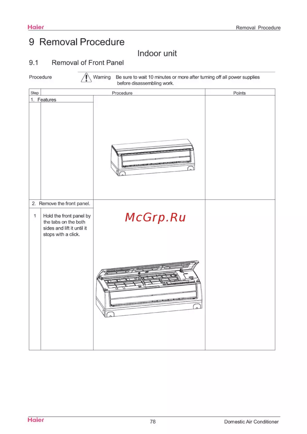 Haier Removal Procedure 9 Removal Procedure Indoor unit 9 1 Removal of Front Panel Procedure Haier Warning Be sure to wait 10 minutes or more after turning off all power supplies before disassembling work 78 Domestic Air Conditioner