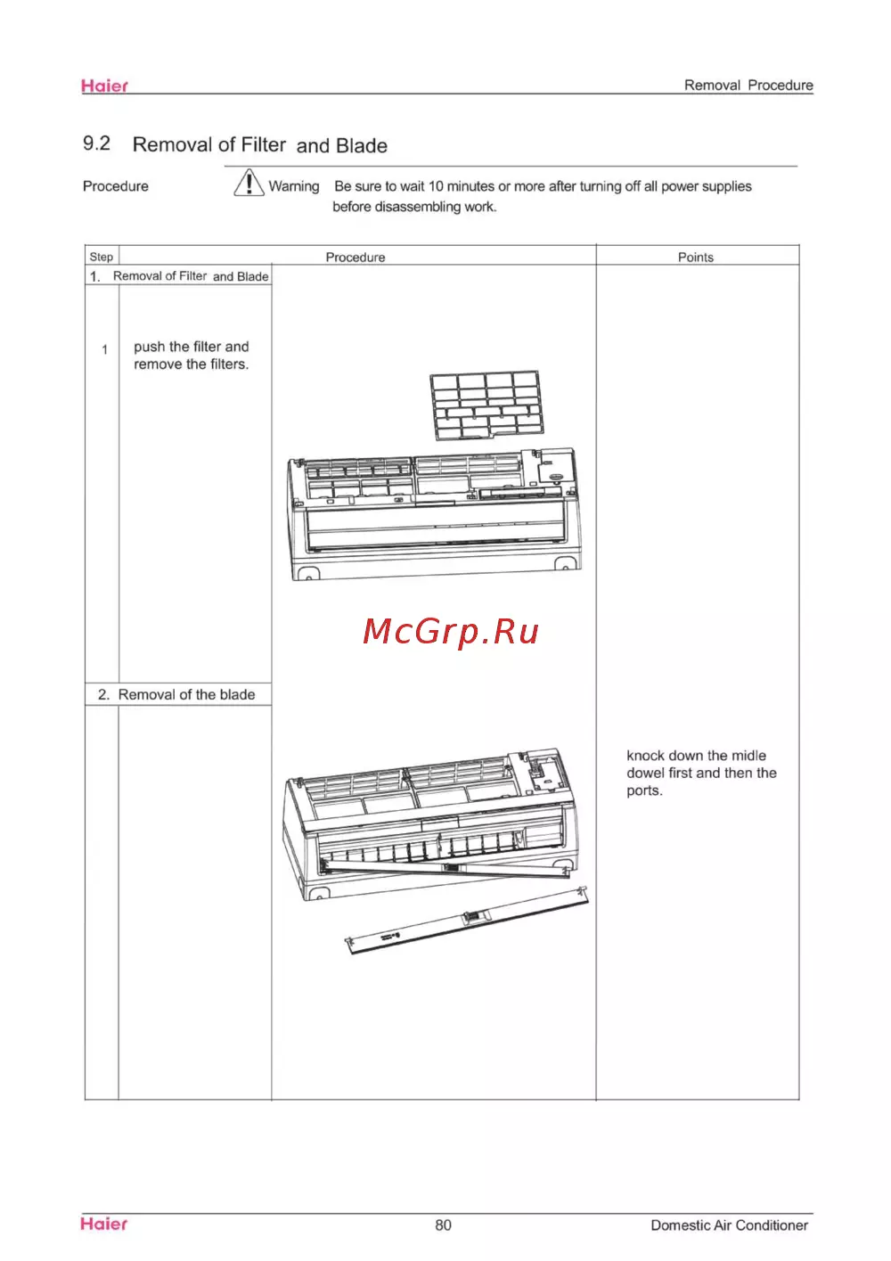 Haier Removal Procedure 9 2 Removal of Filter and Blade Procedure j Warning Be sure to wait 10 minutes or more after turning off all power supplies before disassembling work Step Procedure Points 1 Removal of Filter and Blade 1 push the filter and remove the filters 2 Removal of the blade knock down the midle dowel first and then the ports Haier 80 Domestic Air Conditioner