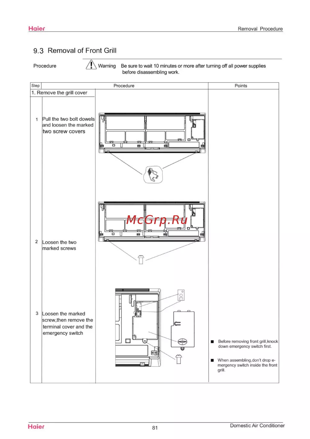 Haier Removal Procedure 9 3 Removal of Front Grill Procedure A Warning Step Be sure to wait 10 minutes or more after turning off all power supplies before disassembling work Procedure Points 1 Remove the grill cover Pull the two bolt dowels and loosen the marked two screw covers Loosen the two marked screws 3 Loosen the marked screw then remove the terminal cover and the emergency switch Before removing front grill knock down emergency switch first When assembling don t drop emergency switch inside the front grill Haier 81 Domestic Air Conditioner
