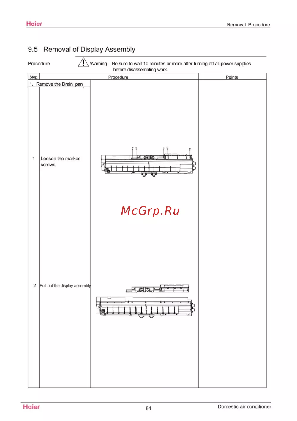 Haief Removal Procedure 9 5 Removal of Display Assembly Procedure Step Warning Be sure to wait 10 minutes or more after turning off all power supplies before disassembling work Procedure Points 1 Remove the Drain pan 1 Loosen the marked screws Haief 84 Domestic air conditioner