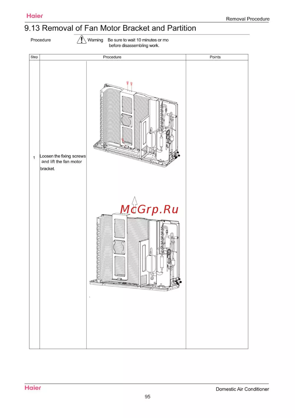 Haier Removal Procedure 9 13 Removal of Fan Motor Bracket and Partition Procedure j Warning Be sure to wait 10 minutes or mo before disassembling work Haier Domestic Air Conditioner 95