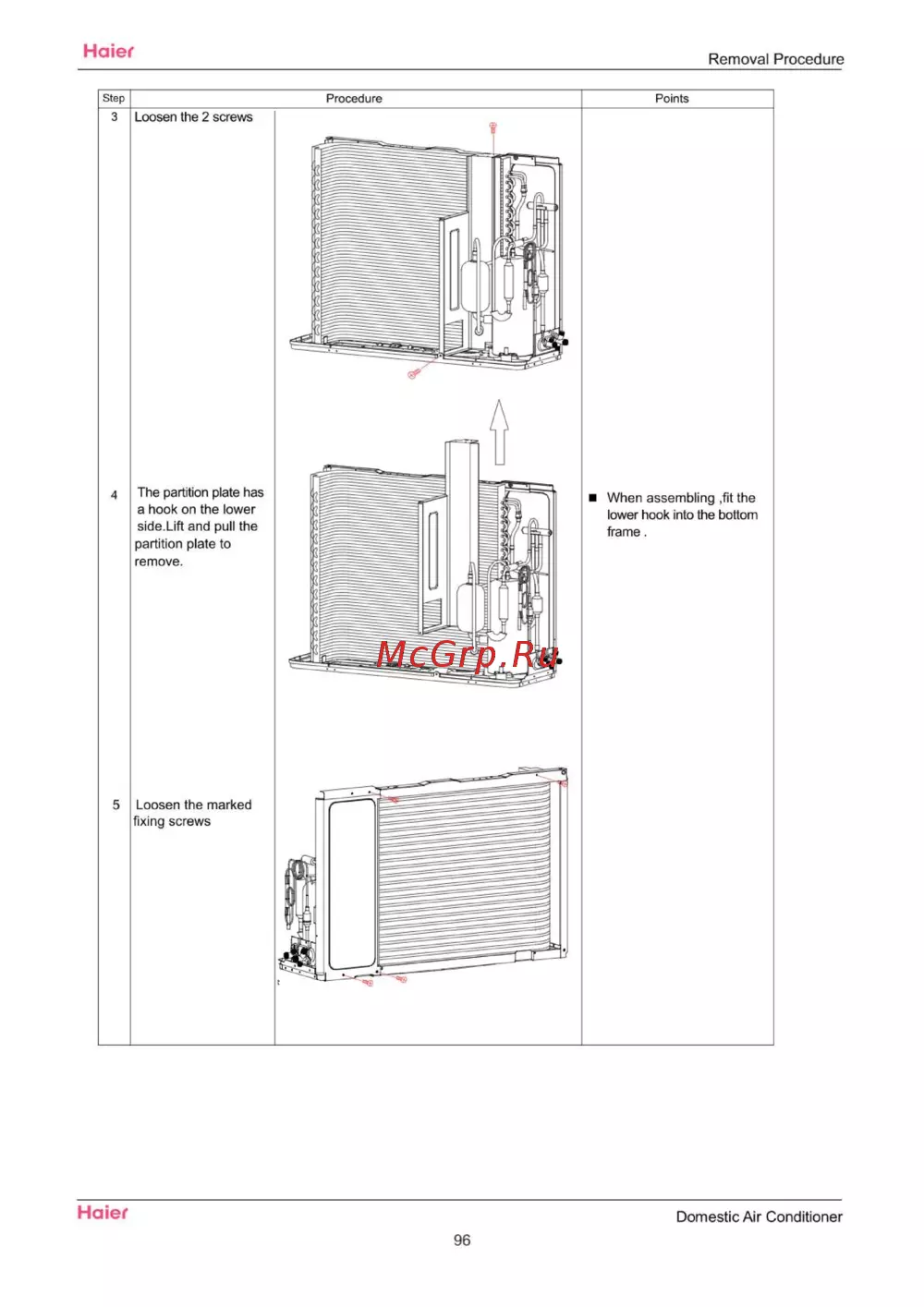 Haier Removal Procedure Procedure Step 3 Loosen the 2 screws 4 The partition plate has a hook on the lower side Lift and pull the partition plate to remove Points When assembling fit the lower hook into the bottom frame Haier Domestic Air Conditioner 96