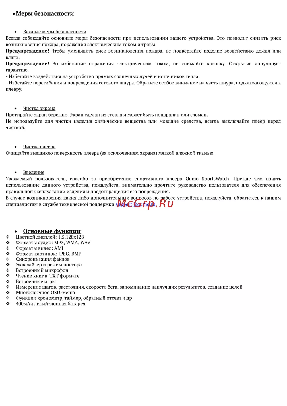 Qumo SPORTSWATCH 4GB WhiteИнструкция по эксплуатации -