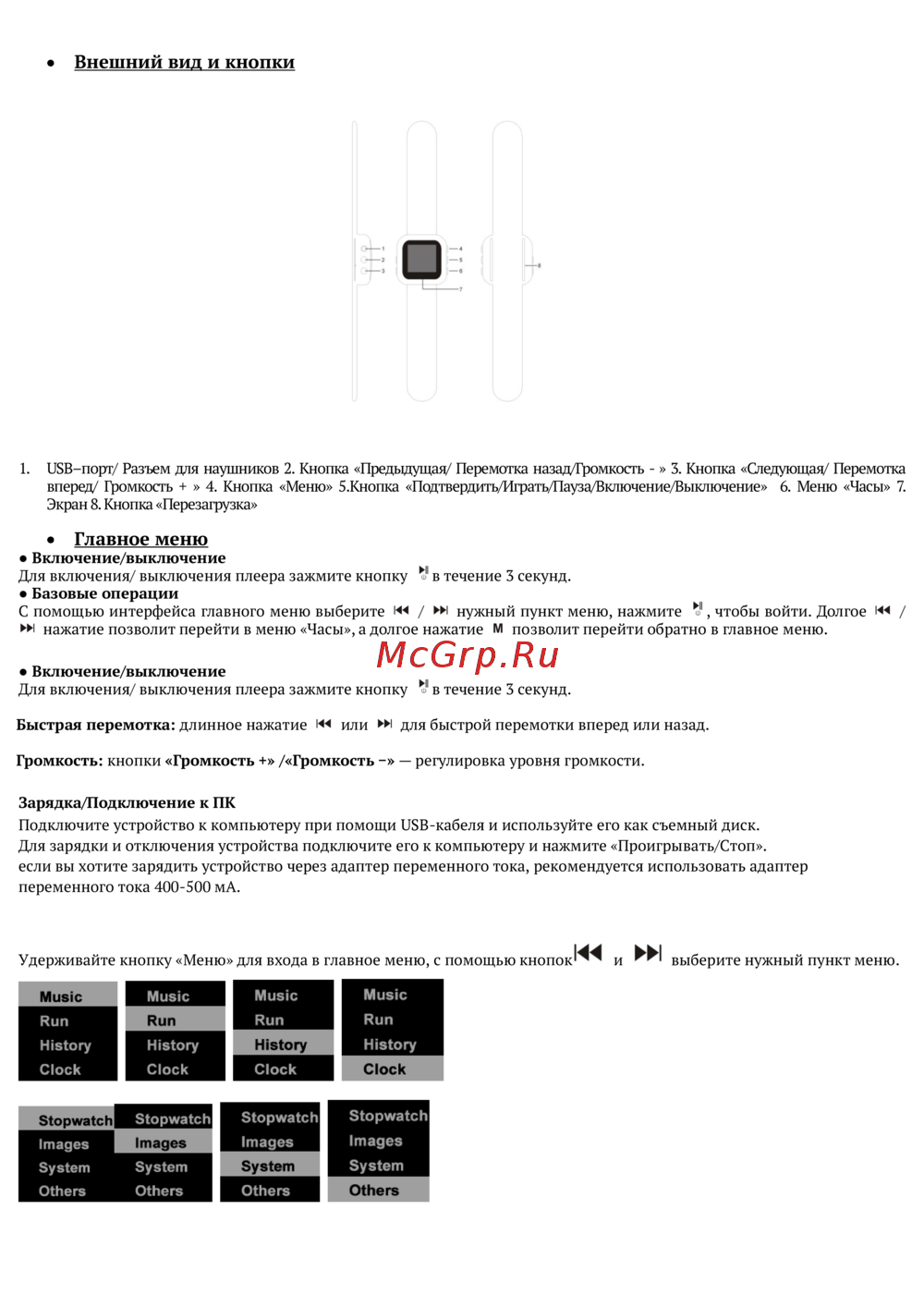 вперед/ Громкость + » 4. Кнопка «Меню» 5.Кнопка «Подтвердить/Играть/Пауза/Включение/Выключение» 6. Меню «Часы» 7.