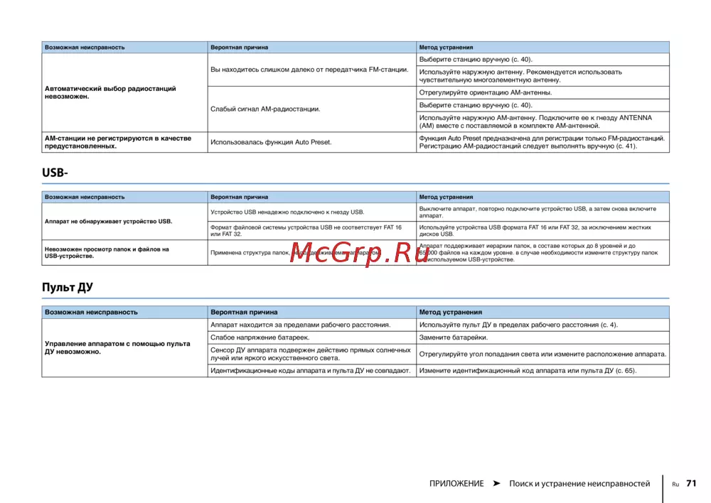 ПРИЛОЖЕНИЕ ➤ Поиск и устранение неисправностей Ru 71
