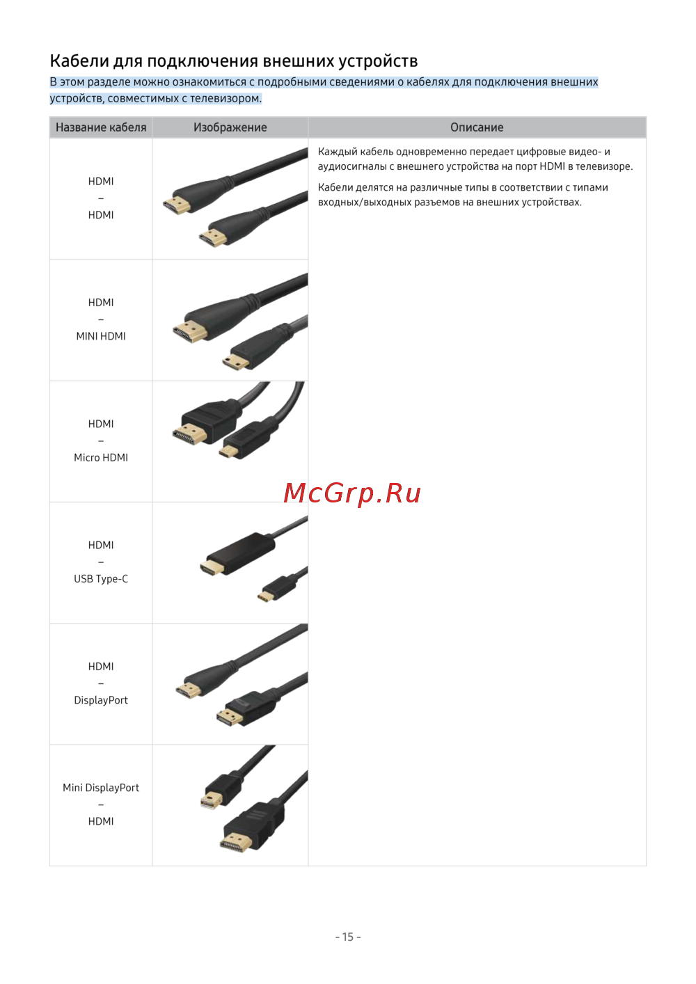 - В этом разделе можно ознакомиться с подробными сведениями о кабелях для подключения внешних устройств совместимых с телевизором p.15