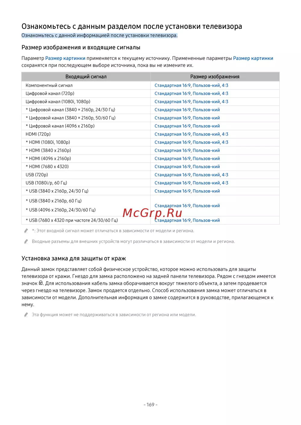 *: Этот входной сигнал может отличаться в зависимости от модели и региона.