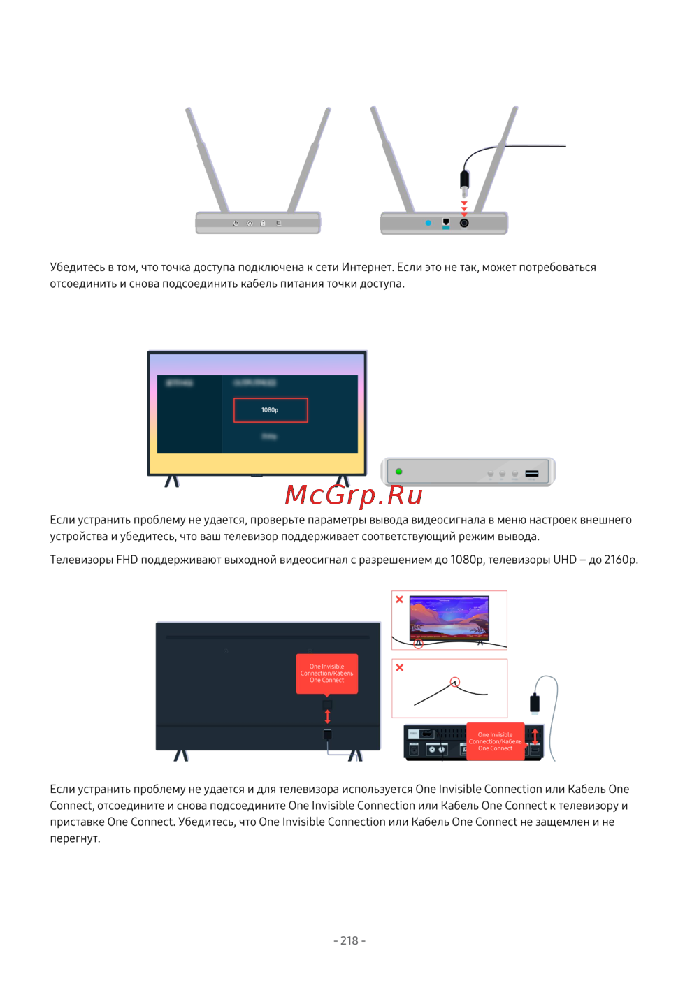 - Отсоедините и снова подсоедините one invisible connection или кабель one connect которым телевизор подключен к приставке one connect убедитесь что one invisible connection или кабель one connect не защемлен и не перегнут p.211