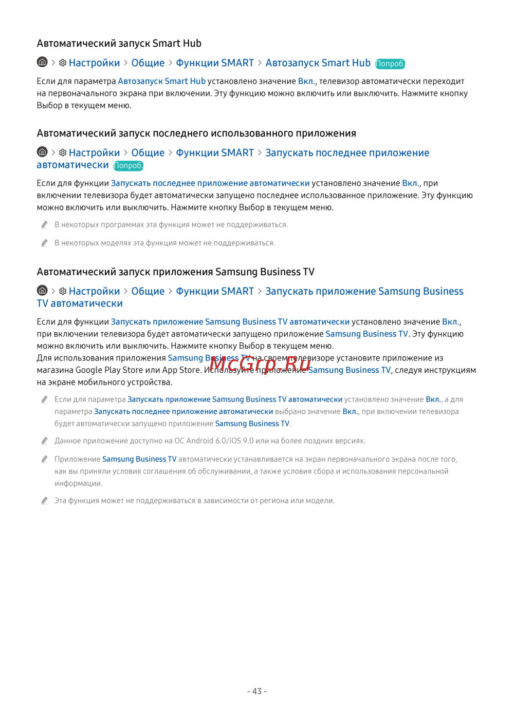 Если для параметра Запускать приложение Samsung Business TV автоматически установлено значение Вкл., а для