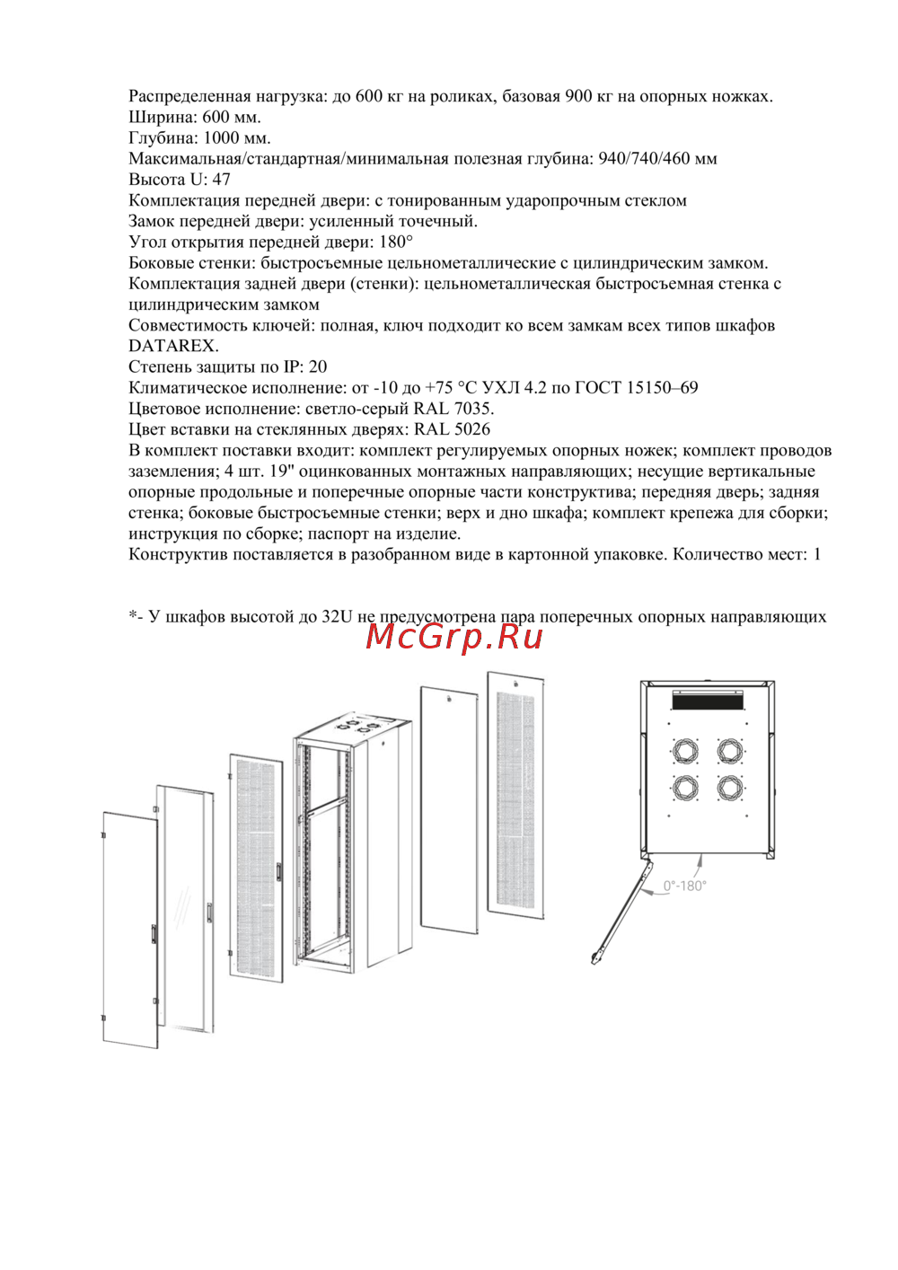 *- У шкафов высотой до 32U не предусмотрена пара поперечных опорных направляющих