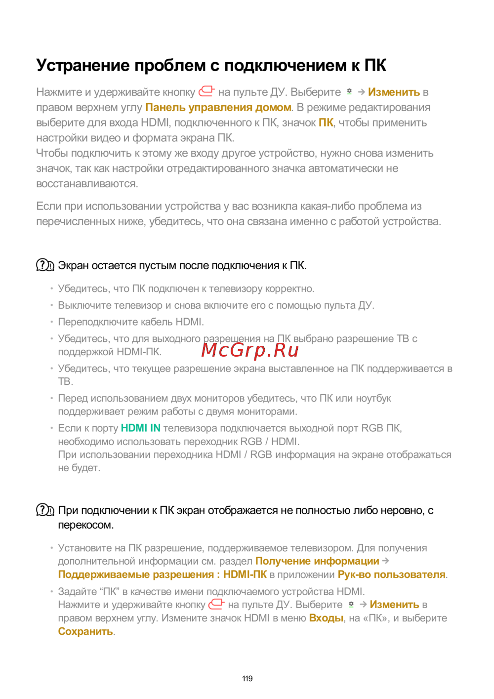 - При подключении к пк экран отображается не полностью либо неровно с перекосом p.119