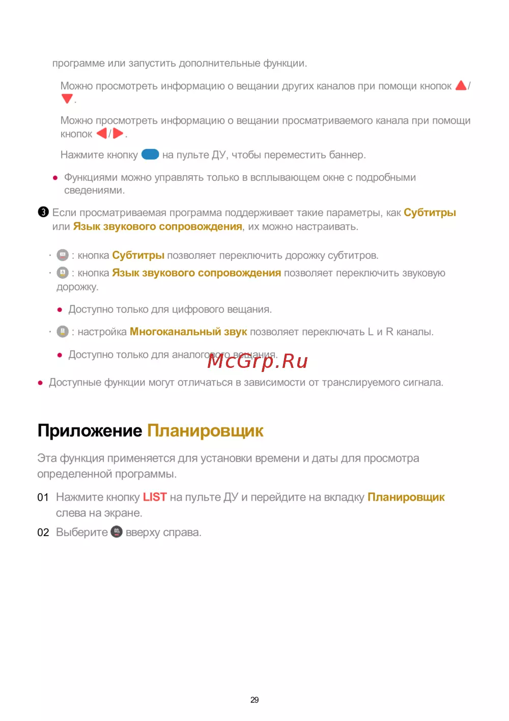 Узнайте о функциях планировщика, настройках субтитров и звукового сопровождения. Управляйте просмотром программ и получайте информацию о вещании.