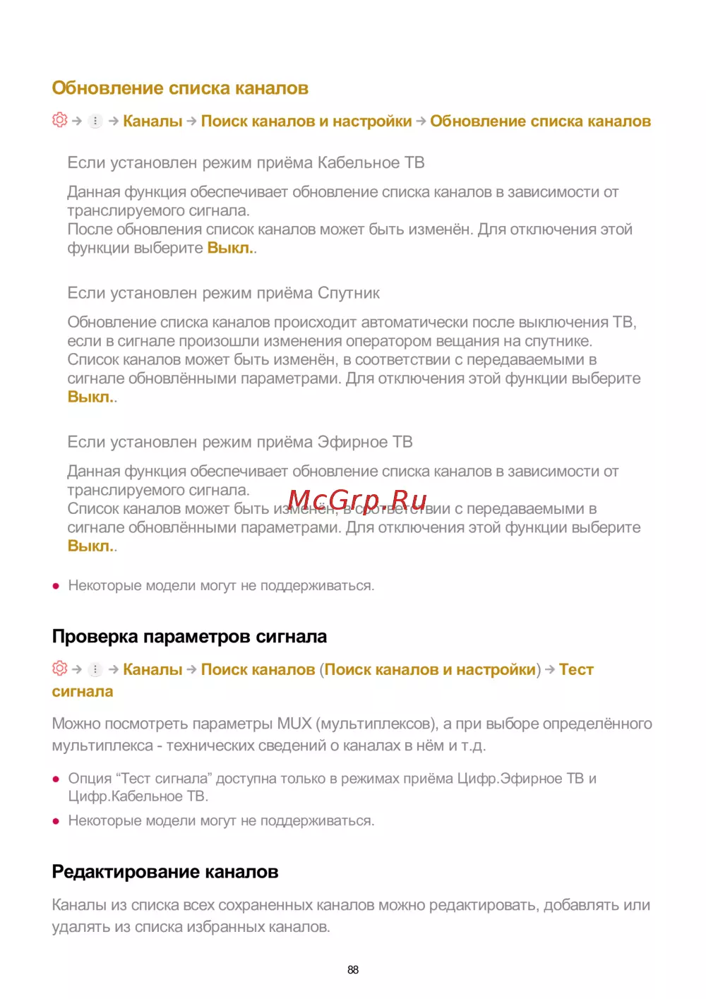 Каналы Поиск каналов и настройки Обновление списка каналов