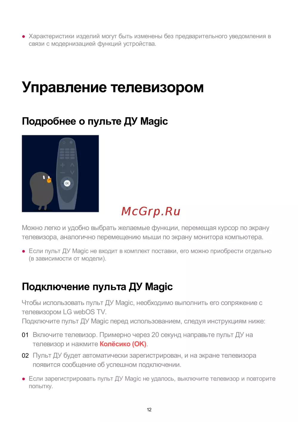 - Если указатель пульта ду magic не отображается на экране телевизора следует выполнить его повторную регистрацию p.13