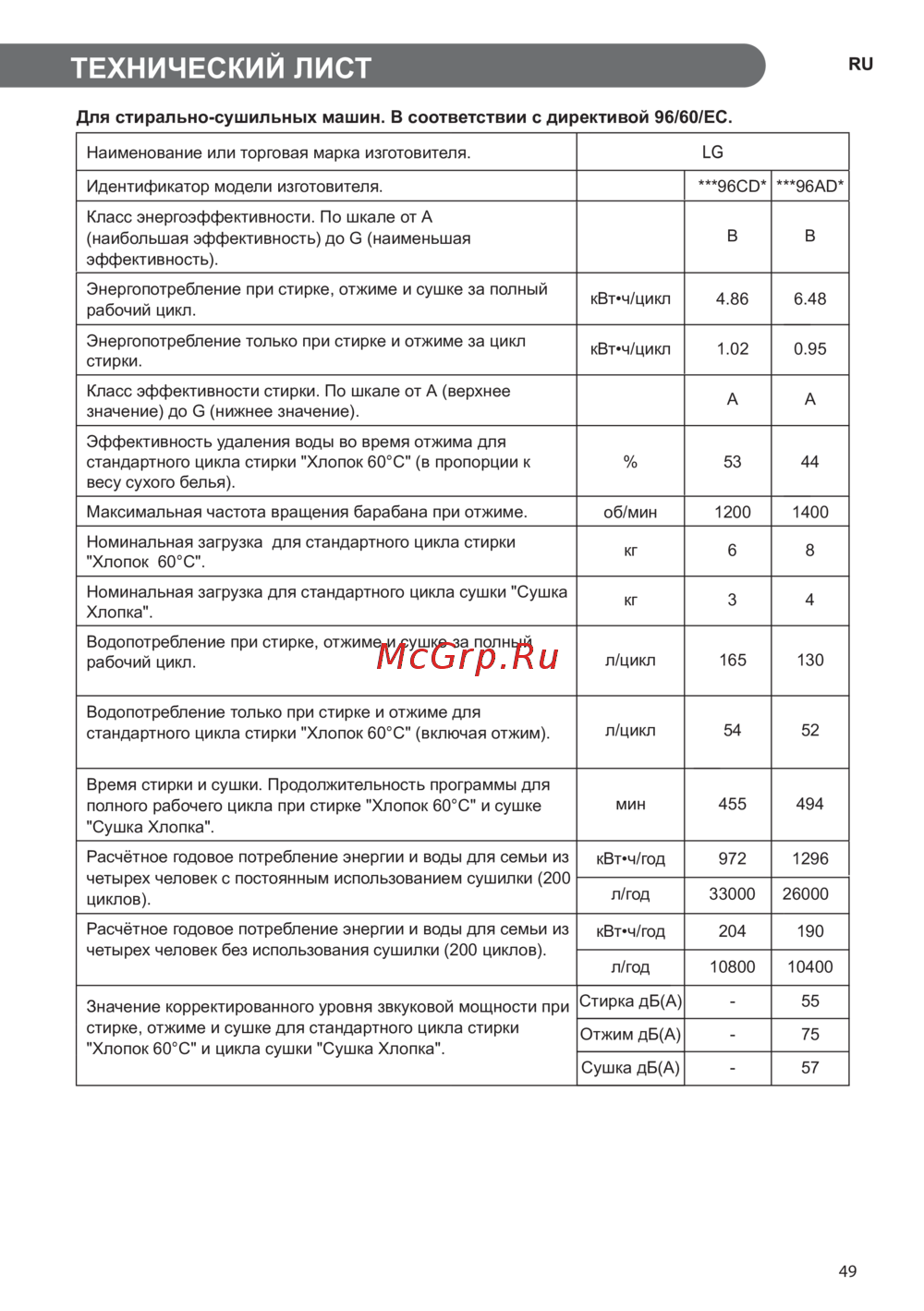 LG F1296HDS1 — технический лист для стирально-сушильных машин: характеристики и эффективность [49/52]
