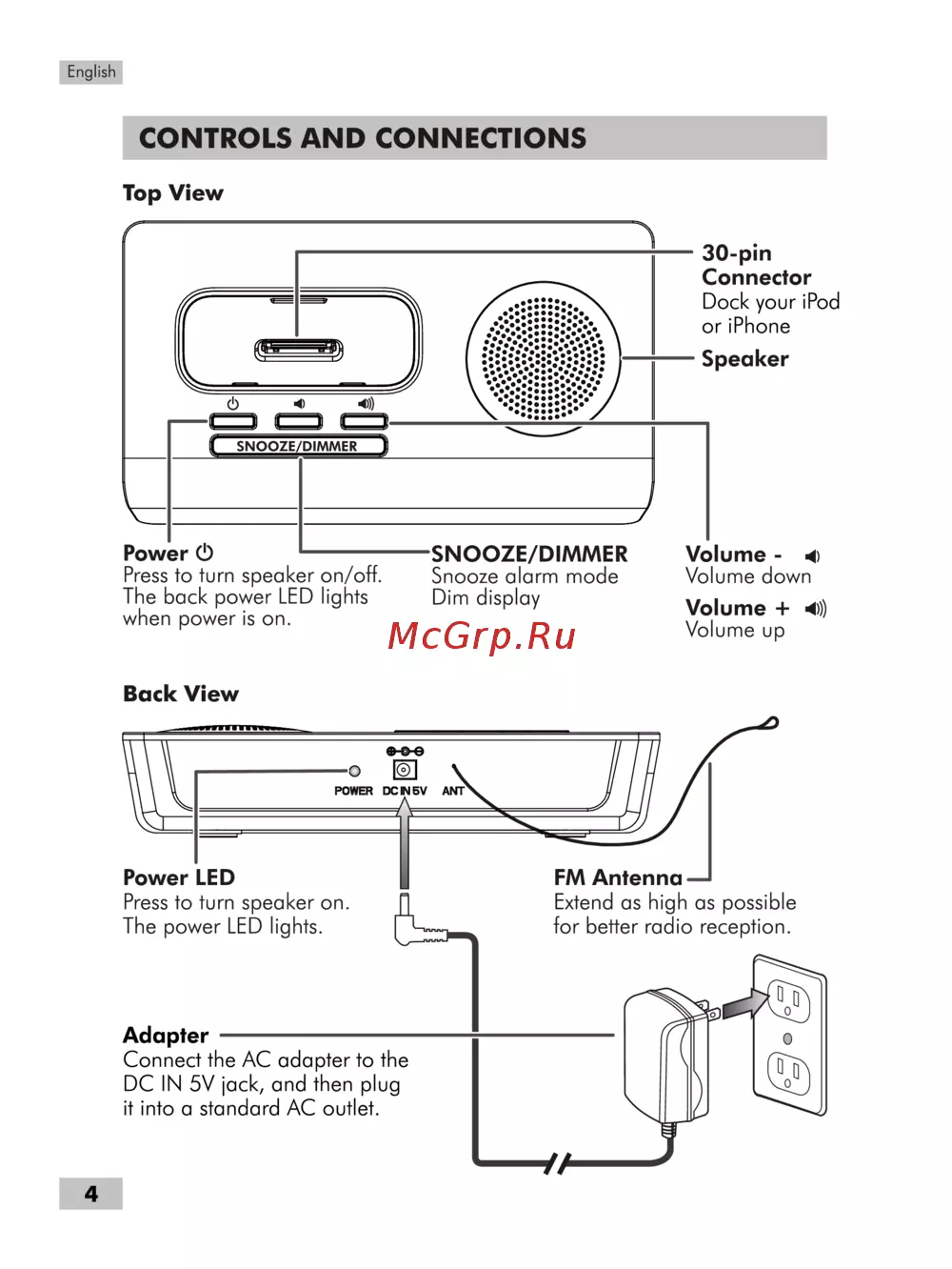 English CONTROLS AND CONNECTIONS Top View 30 pin Connector Dock your iPod or iPhone Speaker Power 0 SNOOZE DIMMER Press to turn speaker on off Snooze alarm mode The back power LED lights Dim display when power is on Volume Volume down Volume 9 Volume up Back View Power LED FM Antenna Press to turn speaker on The power LED lights Extend as high as possible for better radio reception Adapter Connect the AC adapter to the DC IN 5V jack and then plug it into a standard AC outlet 4