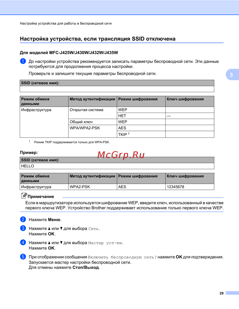 - Примечание если в маршрутизаторе используется шифрование wep введите ключ использованный в качестве первого ключа wep устройство brother поддерживает использование только первого ключа wep p.37