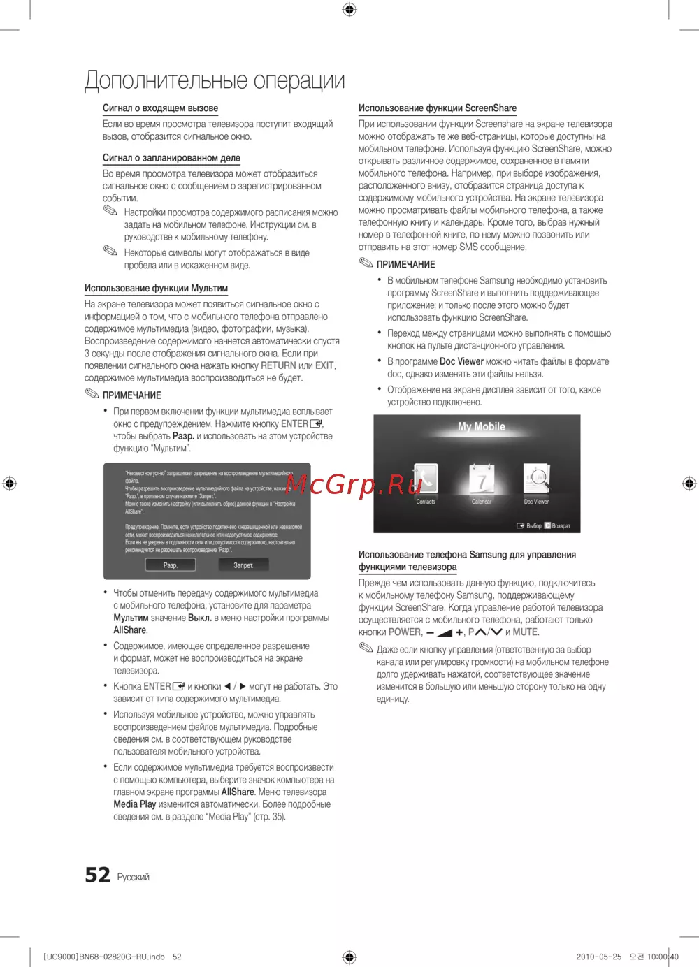 Узнайте, как управлять мультимедиа и использовать функции телевизора с мобильного устройства. Получайте уведомления о вызовах и событиях во время просмотра.