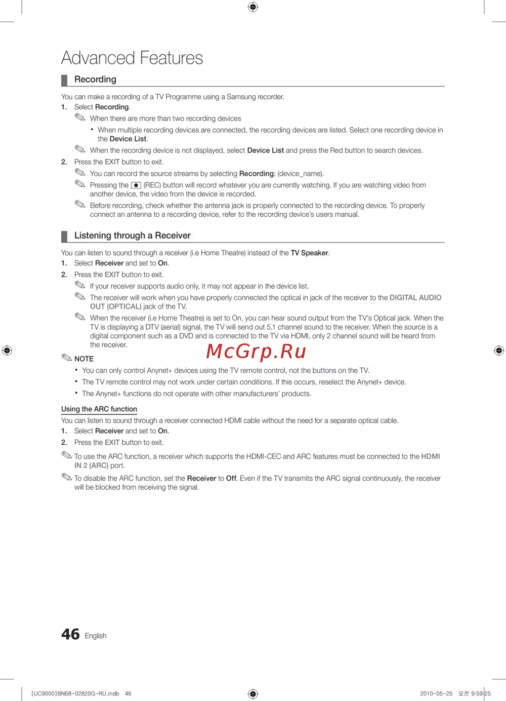 - Переключение между устройствами поддерживающими функцию anynet p.105